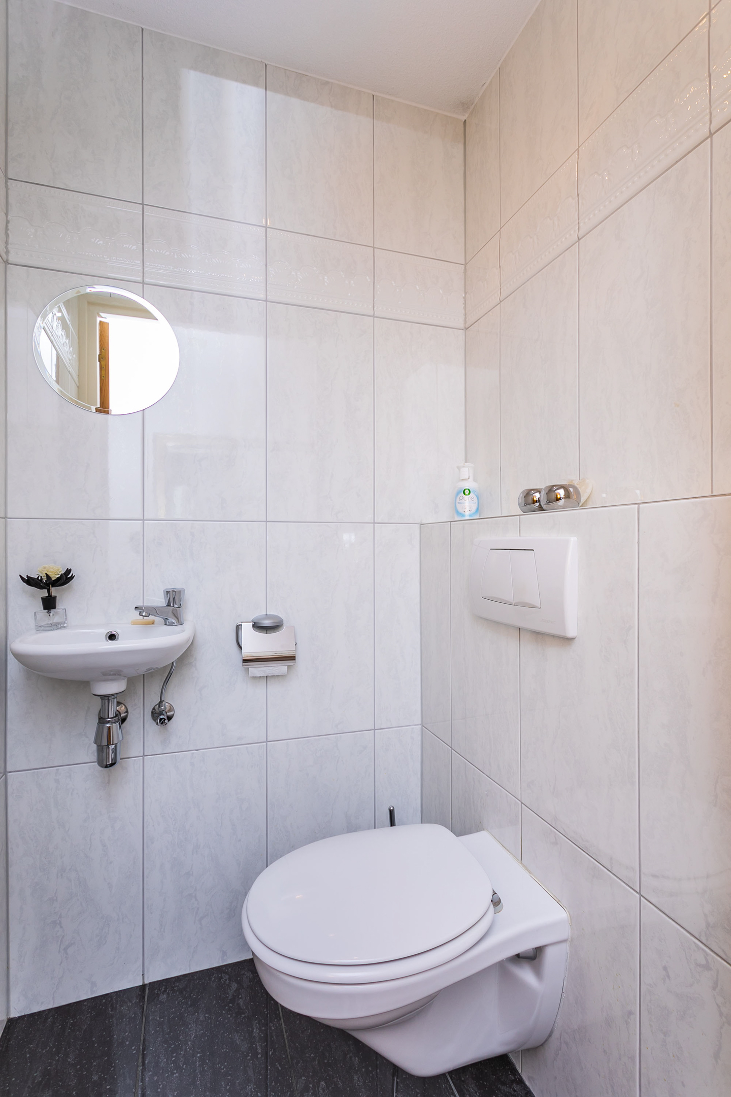 Centrale entree met ruime verdeelhal. Geheel betegeld gastentoilet met zwevend closet en fonteintje. Bergruimte met opslagmogelijkheden, standplaats voor de AWB Themomaster CV-Combiketel met comfort boiler en witgoedaansluitingen voor wasmachine en droger.