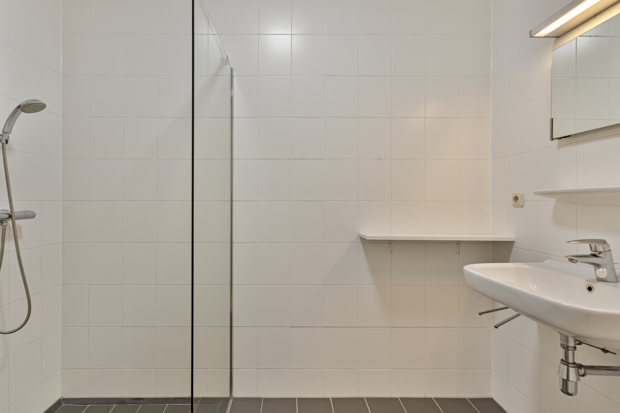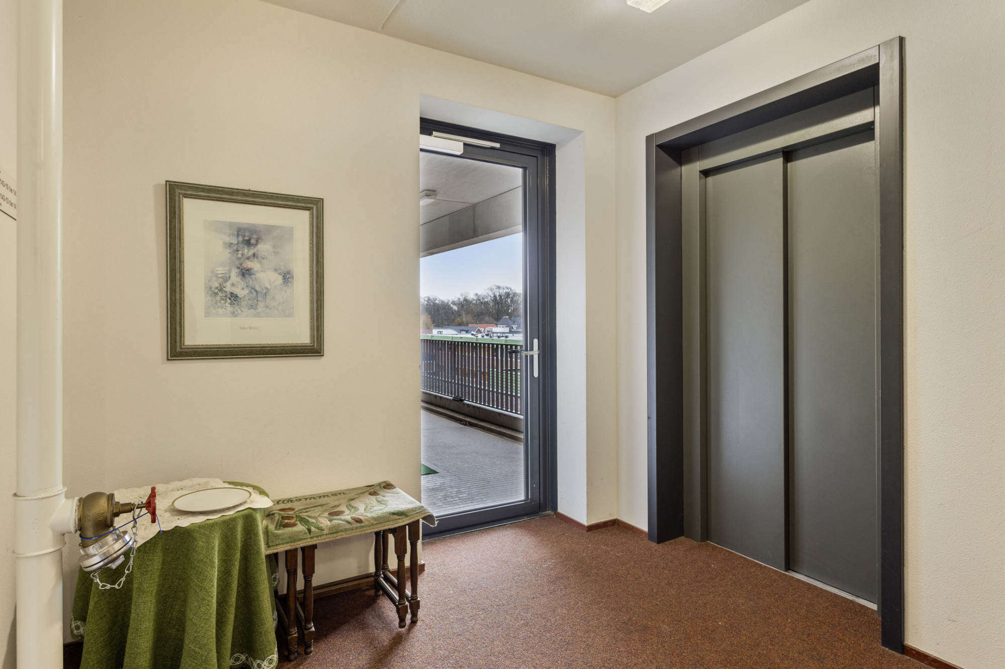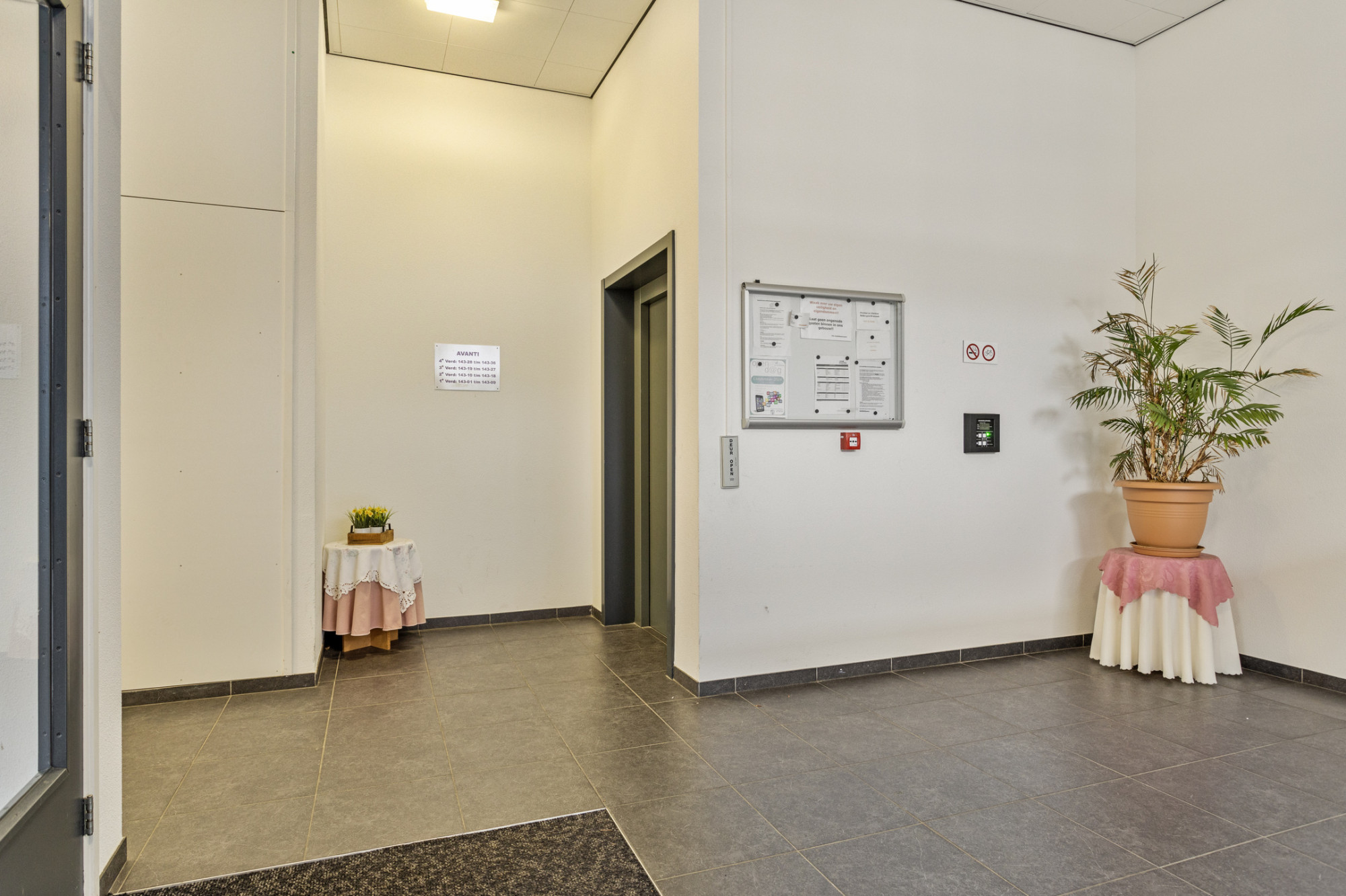 Overdekte entree met bellentableau. Inkomhal met lifinstallatie en trappenhuis.