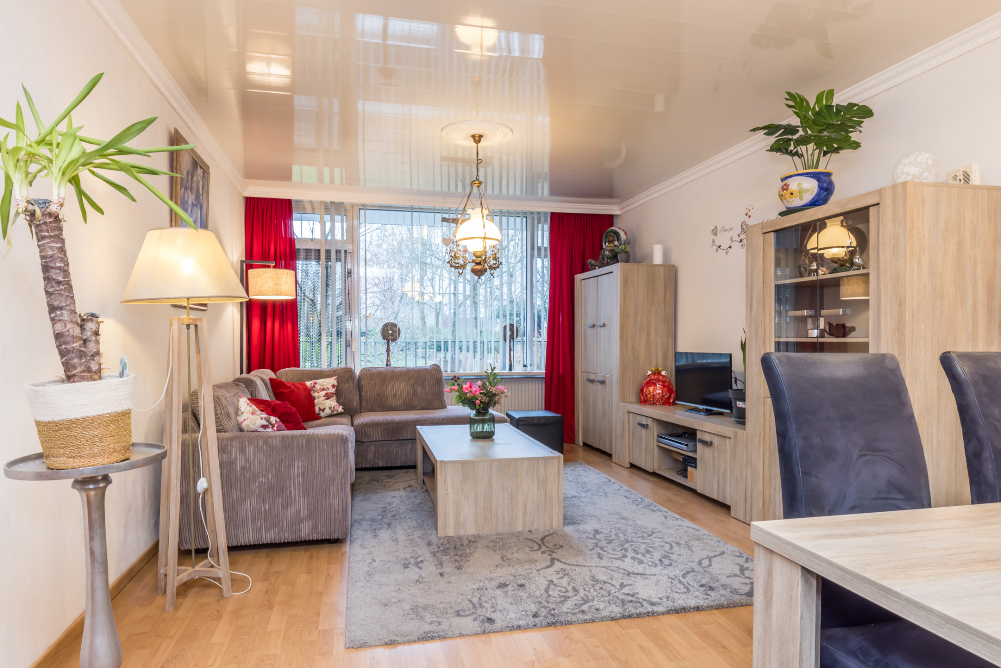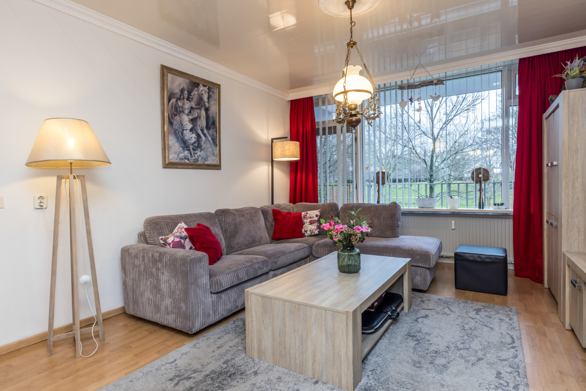 Royale woonkamer, voorzien van een laminaatvloer, met veel lichtinval via de grote raampartijen met loopdeur naar balkon, dat een vrij uitzicht in het groen biedt. Aan de achterzijde gelegen zithoek met audio-/visuele aansluitingen en centraal geplaatst eethoek.