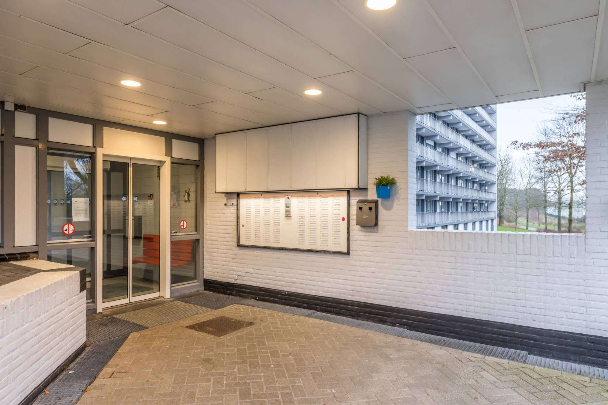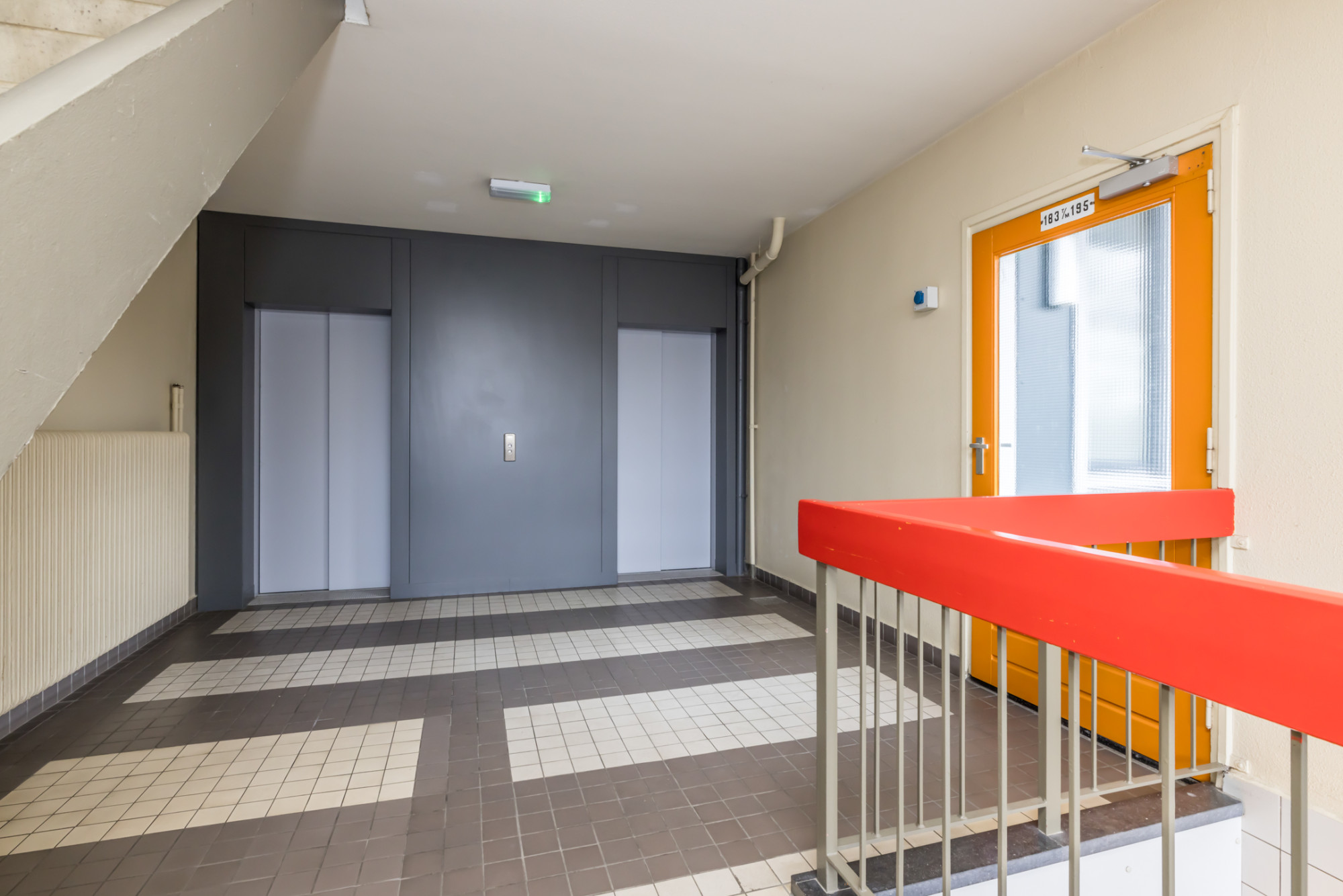 Centrale entree met huismeesters-post, videofoontableau en brievenbussen, trappenhuis, dubbele liftinstallatie.
