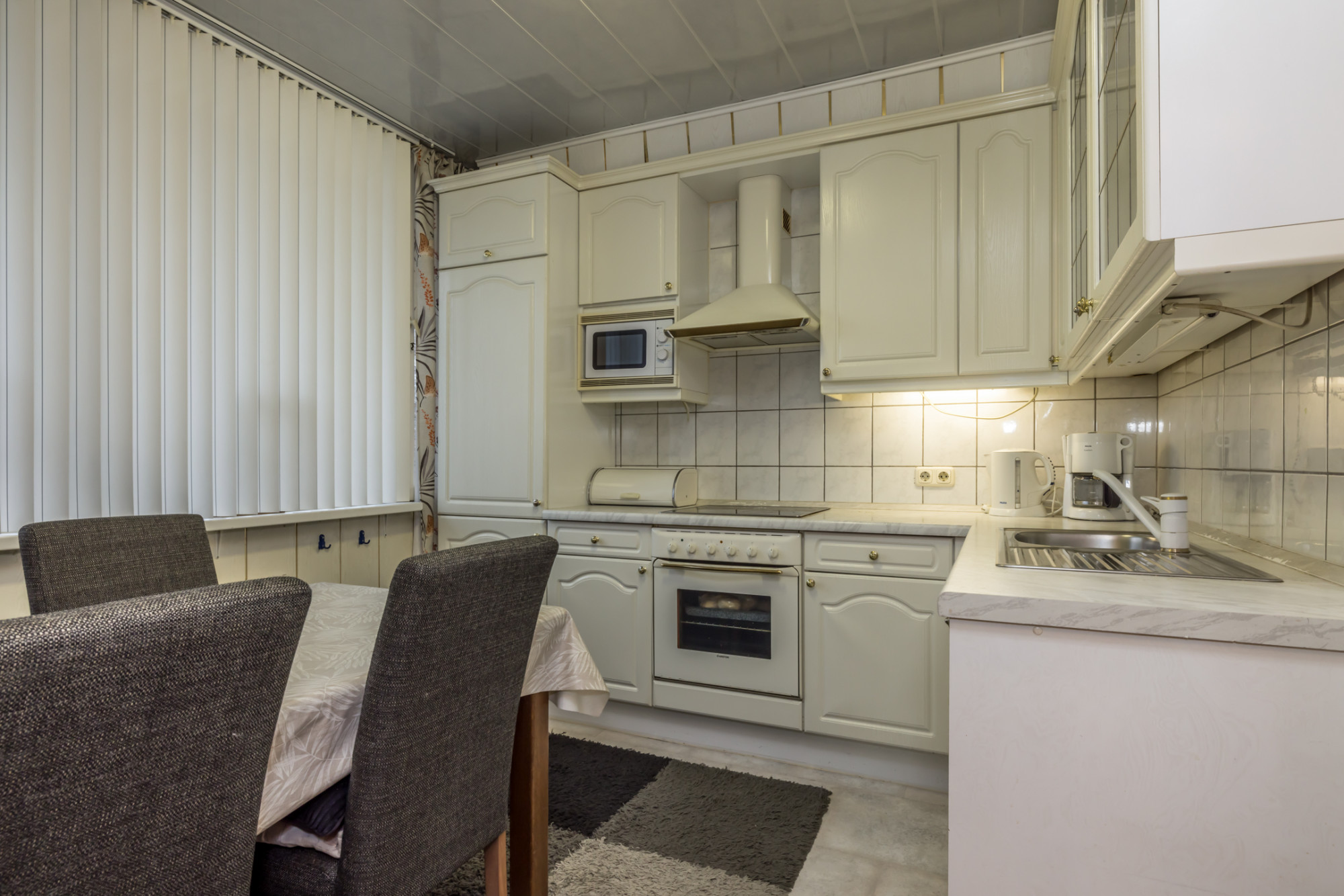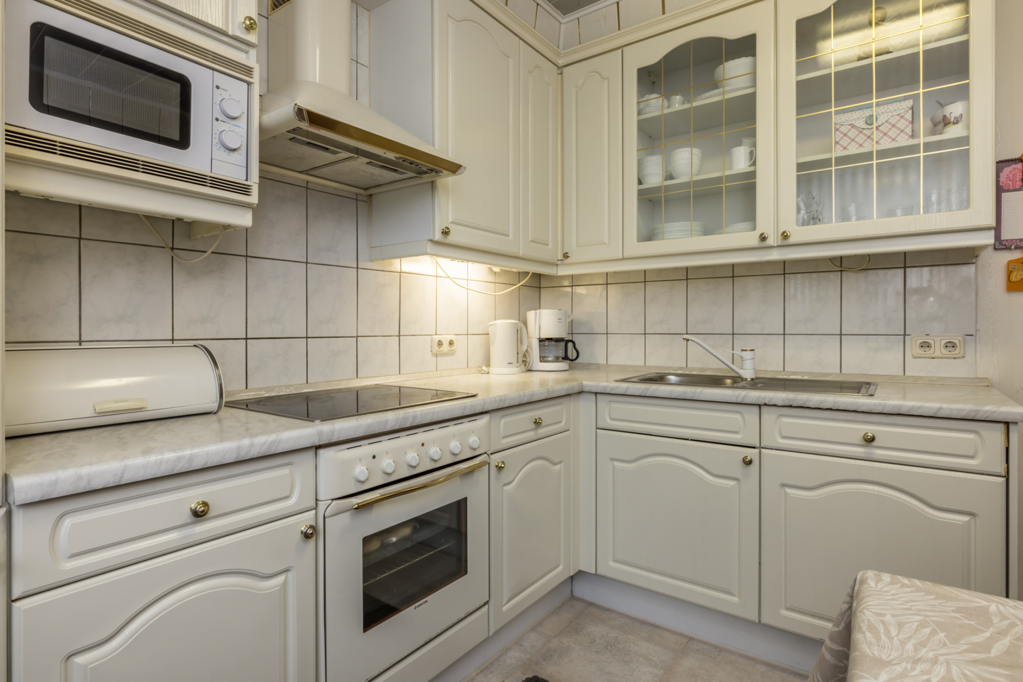 Gesloten separate keukenruimte voorzien van keurige inbouwkeuken in landelijke stijl, met apparatuur, te weten: 4 zones keramische kookplaat / wandschouw afzuigkap / elektrische oven / magnetron / wasbak / vaatwasmachine en koel-/vriescombinatie. Hier is eveneens een eethoek geplaatst.