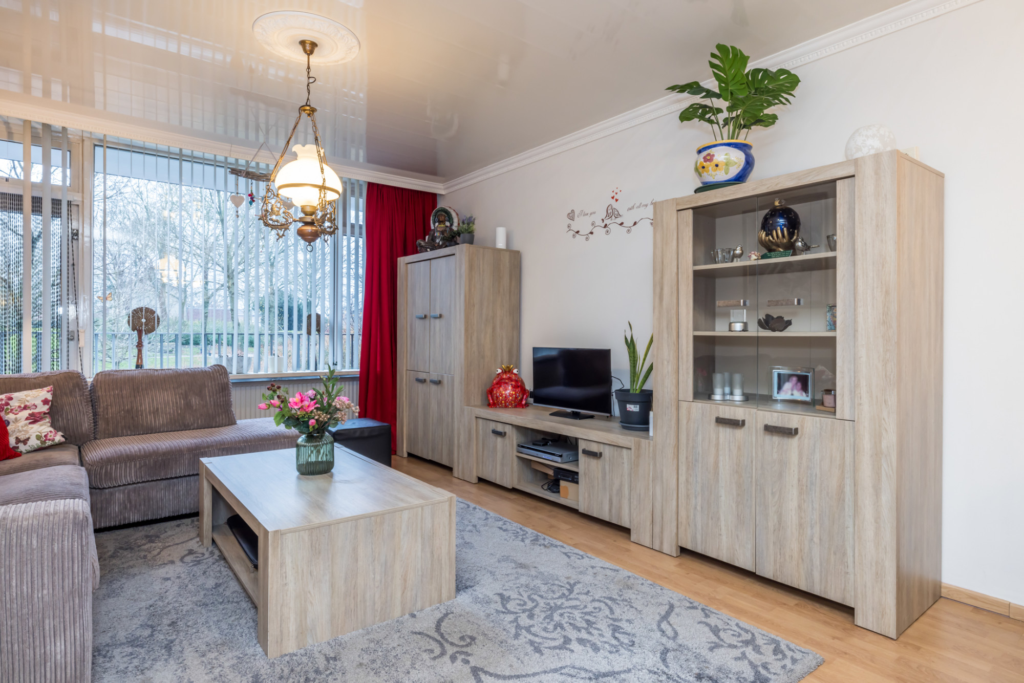 De ruime, lichte woonkamer met laminaatvloer is een heerlijke plek om te ontspannen. Vanuit de woonkamer heeft u toegang tot het balkon, waar u kunt genieten van het vrije uitzicht op het groen.