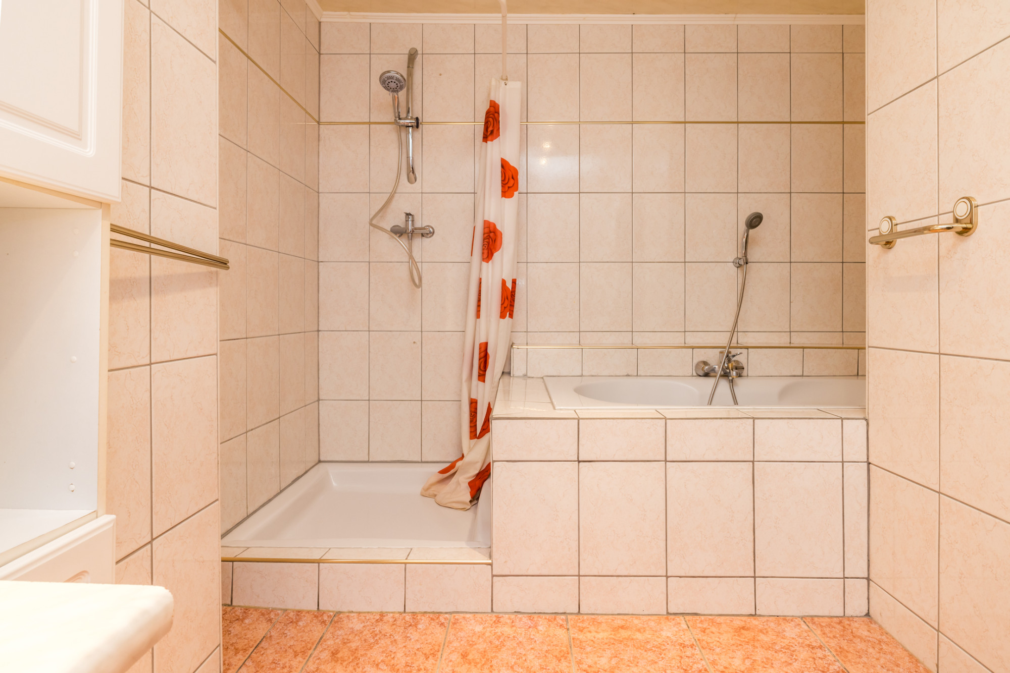 Royale badkamer met ligbad / douche / vaste wastafel in een badkamermeubel / witgoedaansluitingen voor wasmachine en droger, waar eveneens geplaatst de gehuurde warmwaterboiler.