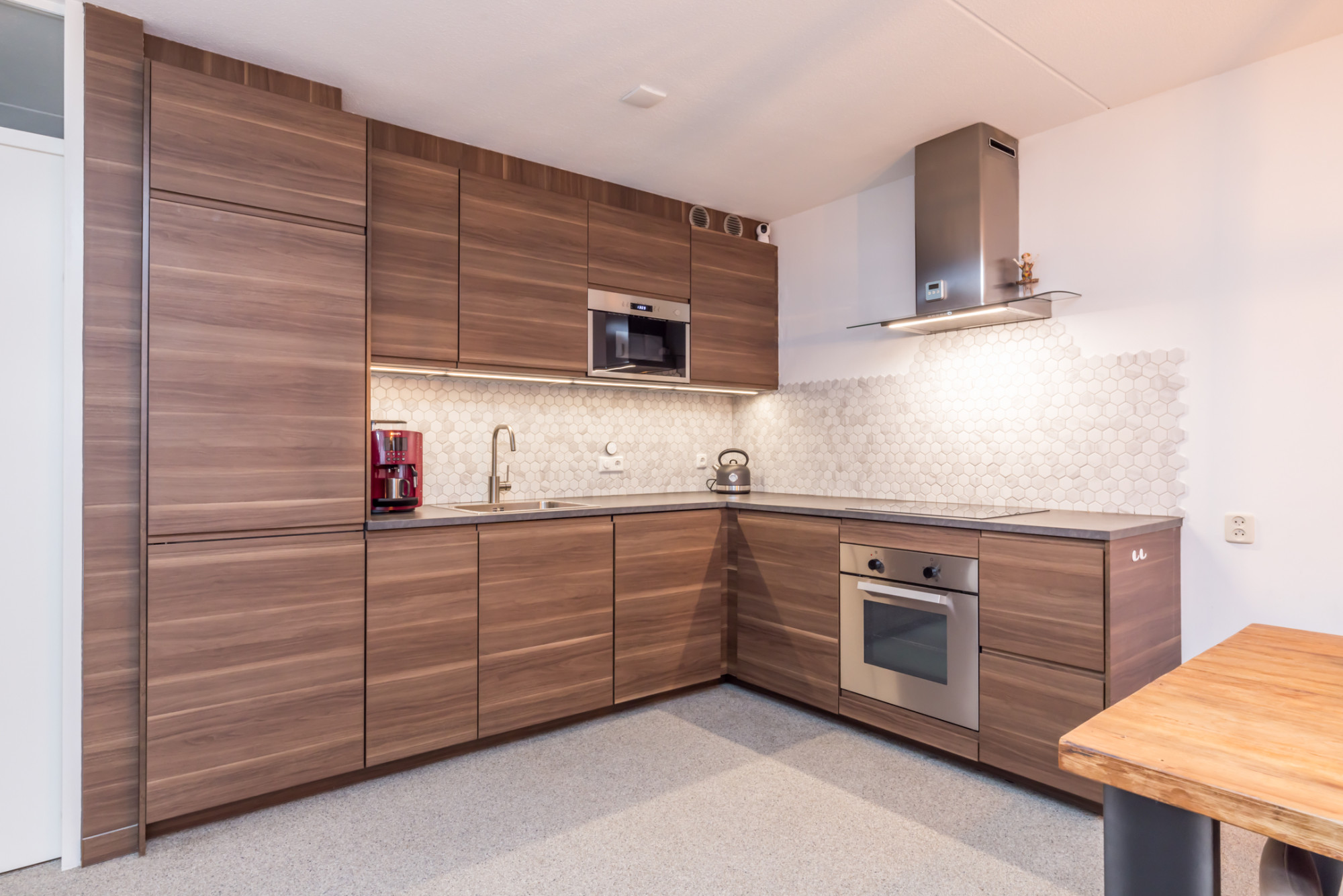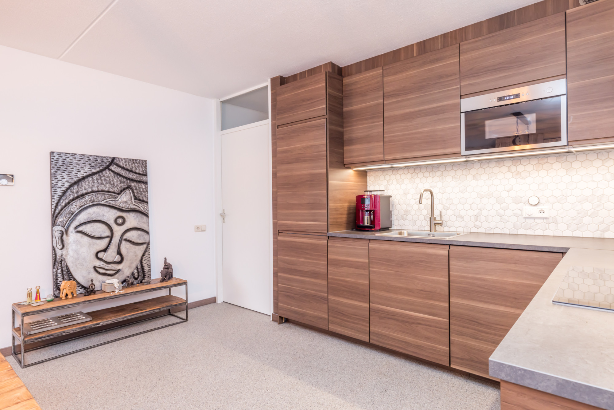 Open keuken, waar geplaatst een moderne en hoogwaardige inbouwkeuken in hoekopstelling. Veel opbergruimte en apparatuur, te weten: 4 zones inductie kookplaat / wandschouw afzuigkap / elektrische oven / magnetron / wasbak / vaatwasmachine en koel-/vriescombinatie.