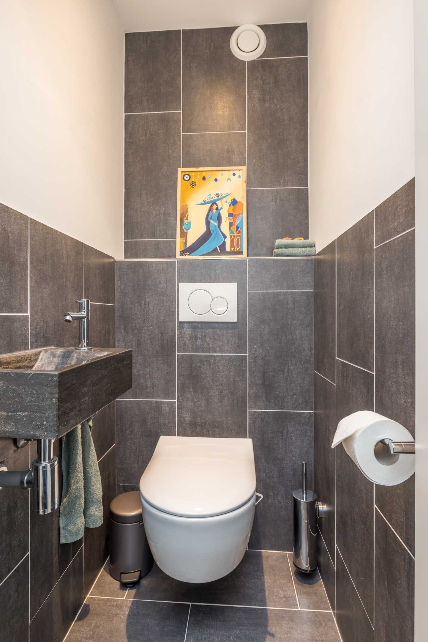 Half betegeld gastentoilet met zwevend wandcloset en fonteintje.