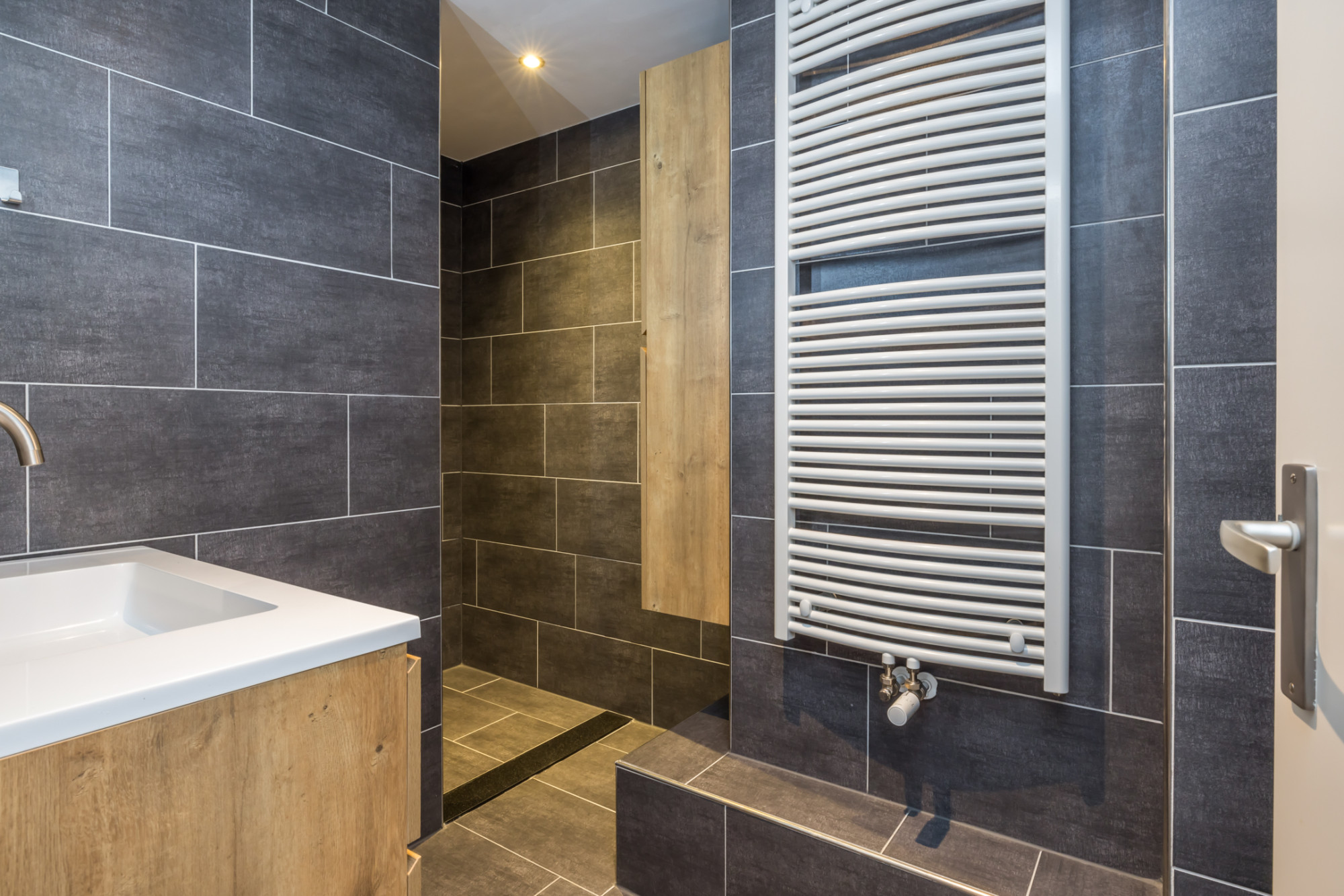 Centraal geplaatste, strakke moderne badkamer voorzien van een inloopregendouche / wastafel in een badkamermeubel en handdoekradiator.