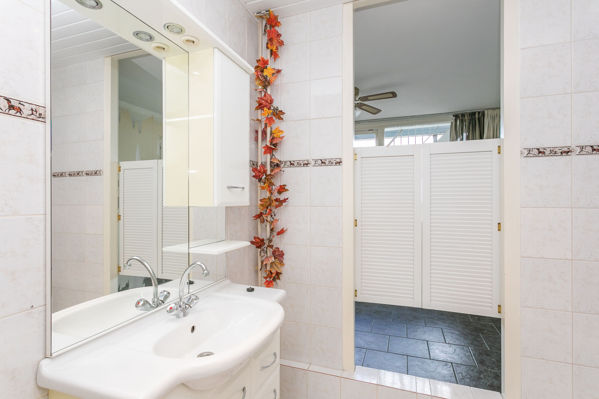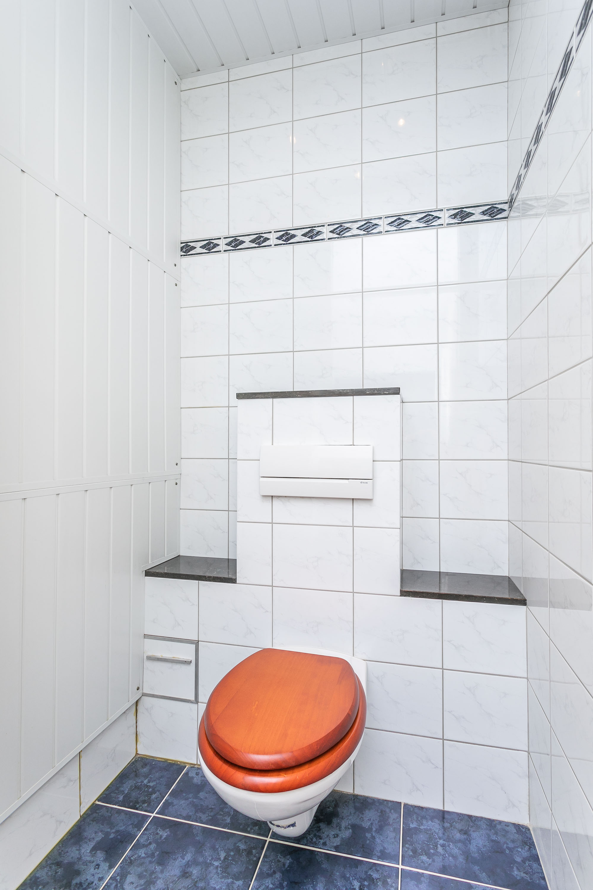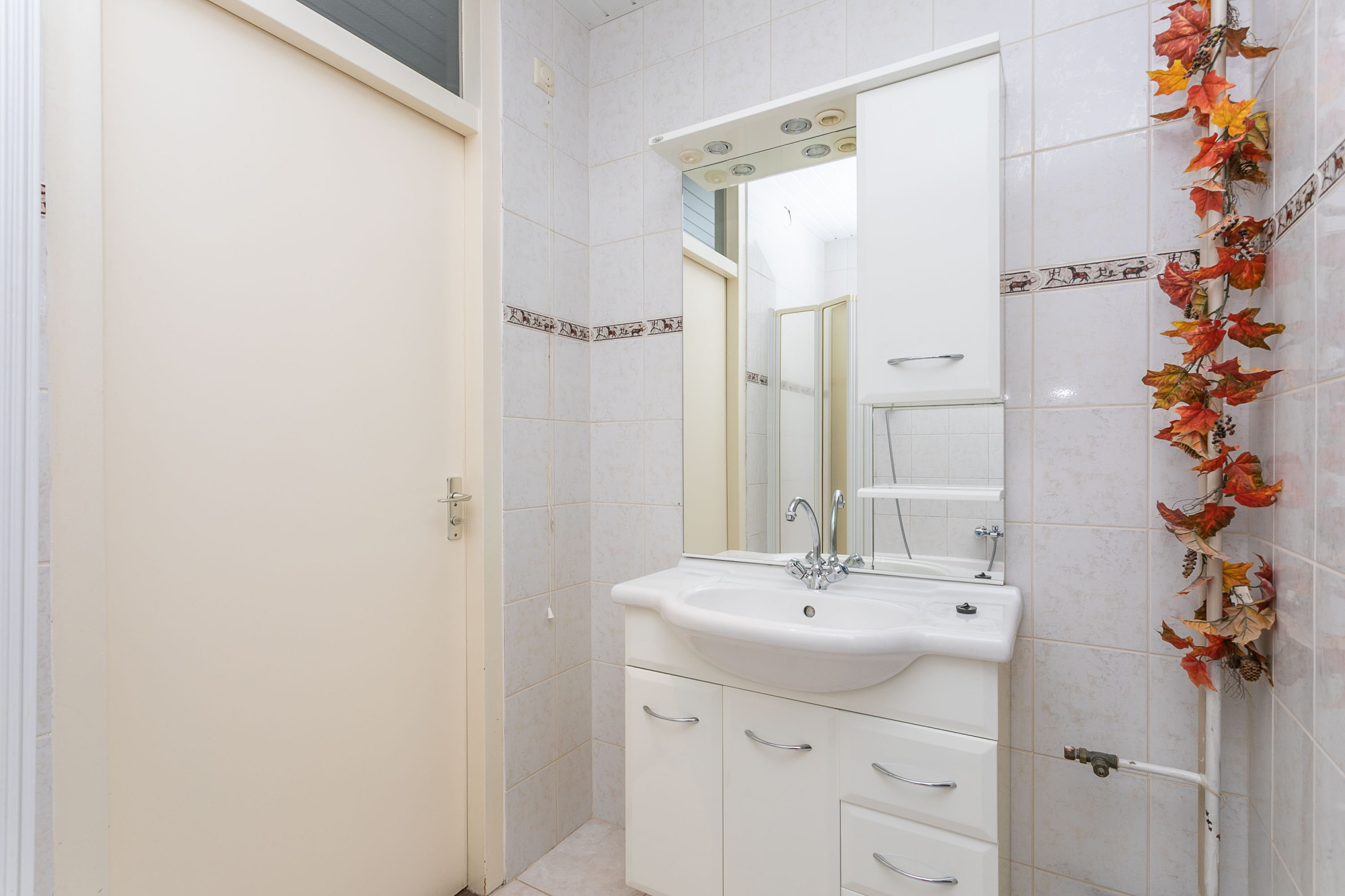 Via een tussenportaal met bergruimte in een kastenwand is er toegang tot het gastentoilet met zwevend wandcloset, de badkamer en het slaapvertrek aan de achterzijde.