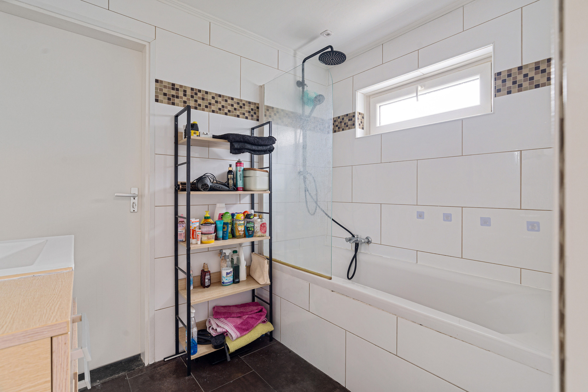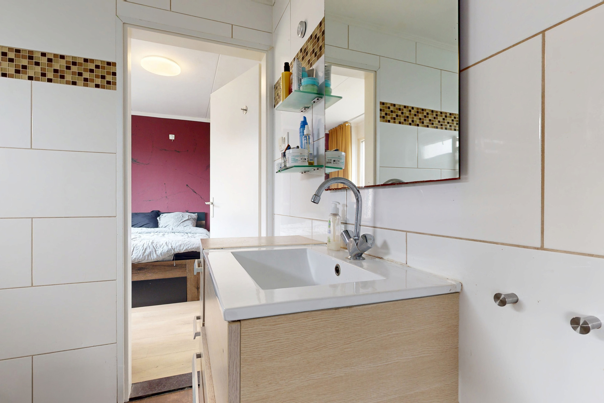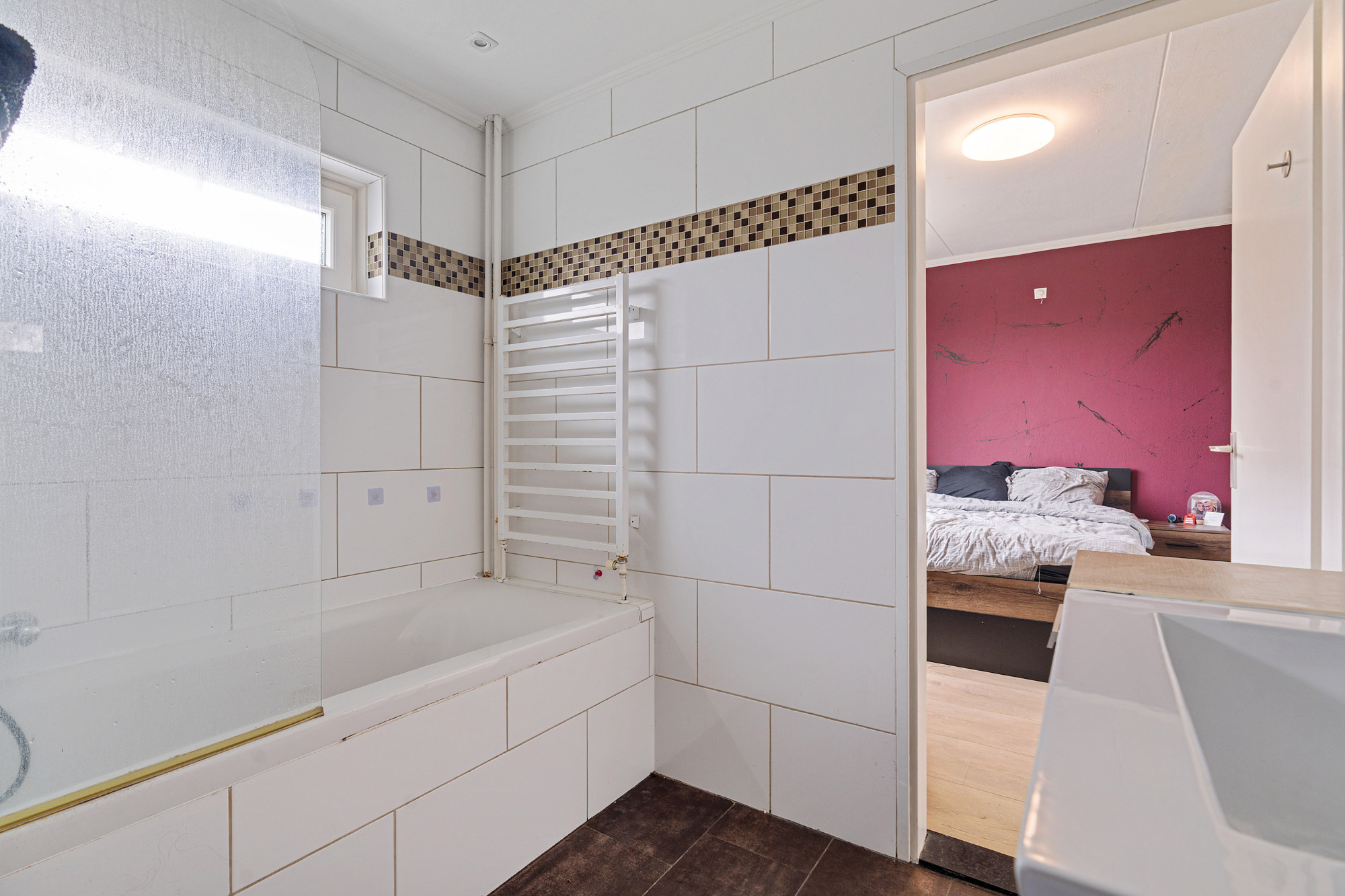 Vanuit beide slaapkamers is de badkamer met ligbad en wastafel met meubel te bereiken.