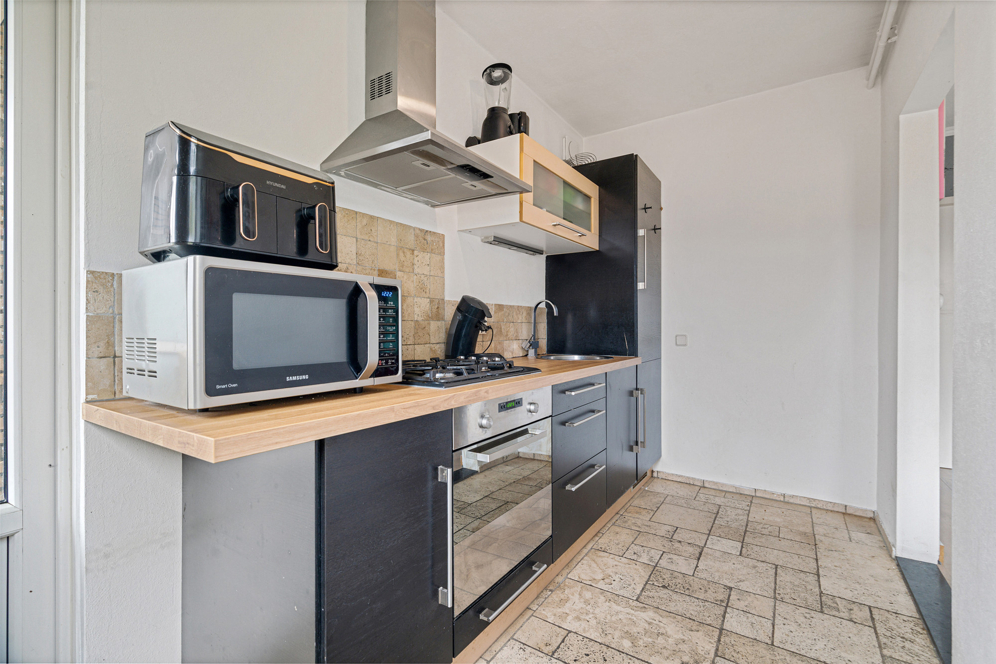 Hal / entree van het appartement met toegang tot de bijkeuken, slaapkamer 1, modern toilet met hangcloset en fontein en de woonkamer. De bijkeuken is voorzien van alle witgoedaansluitingen en standplaats cv-installatie (eigendom, 2021). De woonkamer is ingedeeld met zit- en eetgedeelte en toegang tot slaapkamer 2. De halfopen keuken met rechte opstelling is voorzien van de navolgende apparatuur: koelkast, diepvries, 4-pits gaskookplaat, afzuigkap en oven. Middels loopdeur is het balkon bereikbaar.