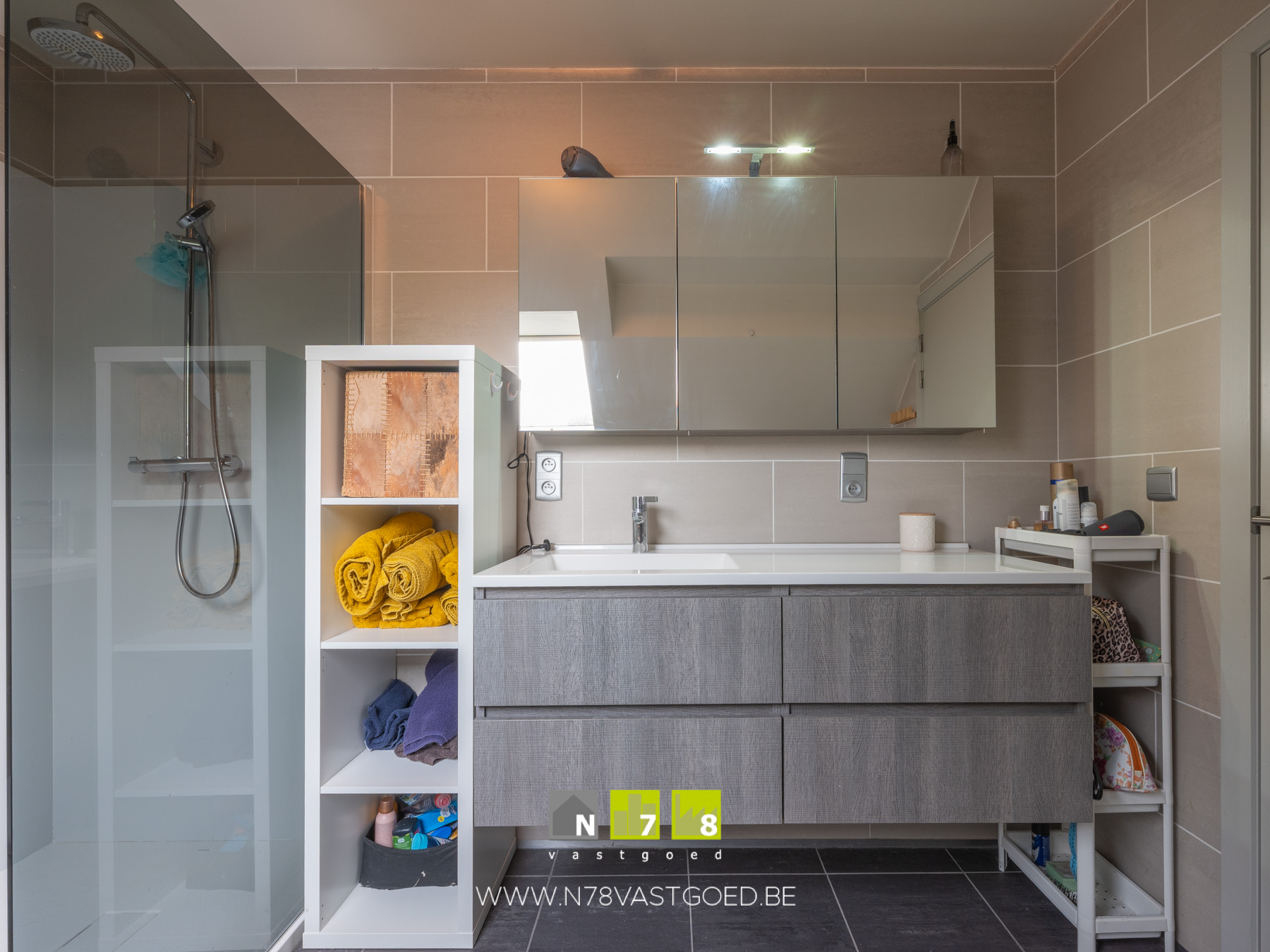 - Badkamer (3,2m x 3m = 9,60m²): ingericht badmeubel met enkele lavabo, onderlades, spiegelkasten met verlichting; inloopdouche, hangtoilet,betegelde achterwand, tegelvloer.