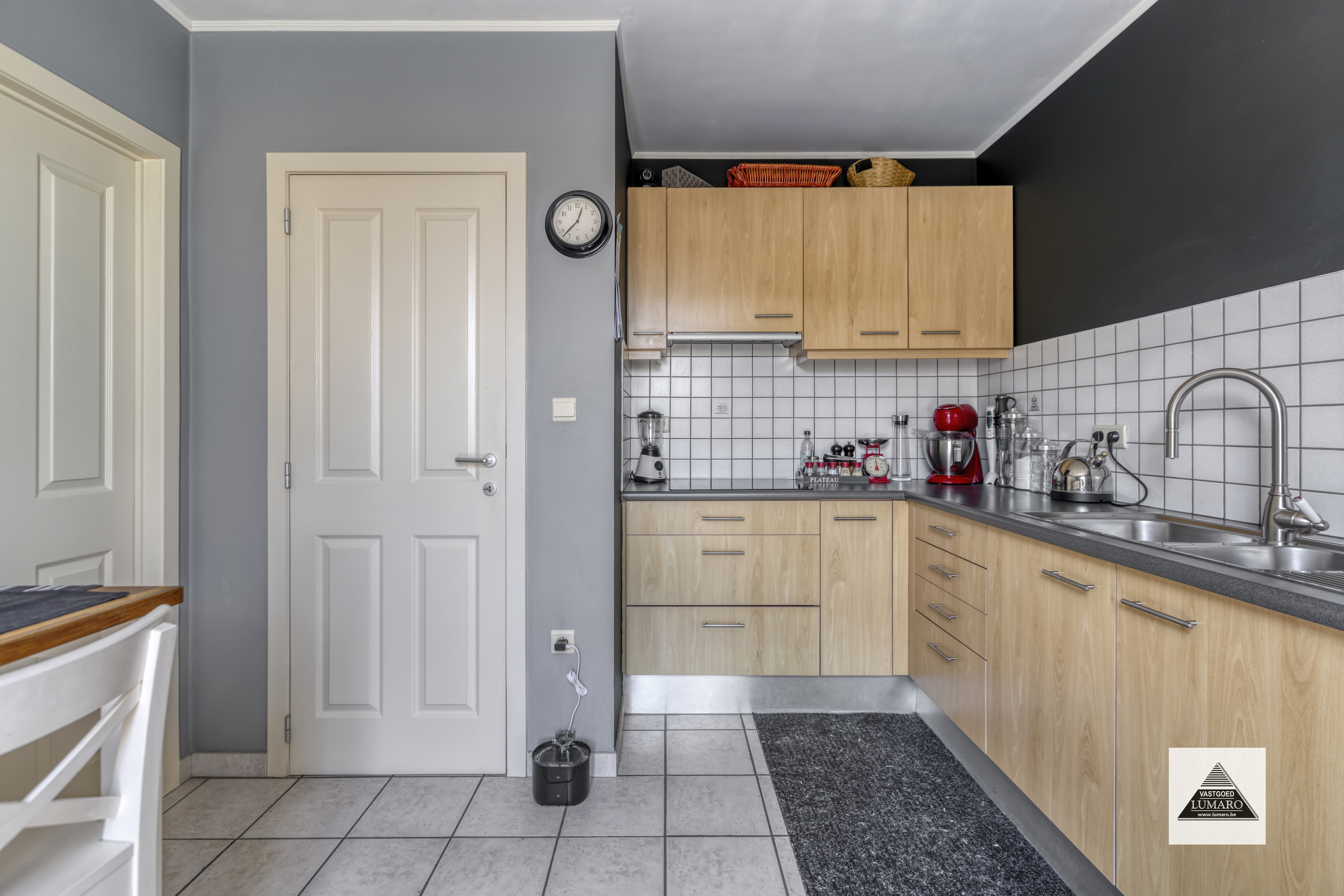 - Keuken: (2,79 m x 3,31 m = 9,23 m²) – tegelvloer – afzonderlijke werkkeuken met toegang naar het terras – keuken is ingericht met onder- en bovenkasten in houttint – kunststof werkblad – dubbele inox spoelbak met afdruiprek en eengreepsmengkraan – keramische kookplaat – dampkap – betegeling tussen onder- en bovenkasten –