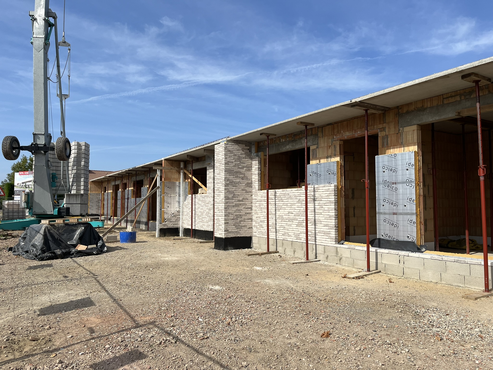 2) 5 appartementen op de eerste verdieping, bereikbaar via een lift. Hier zijn 3 appartementen met 2 slaapkamers, en 2 appartementen met één slaapkamer, telkens met een overdekt terras op het zuid-westen. Achter het gebouw heeft iedereen een tuinberging.