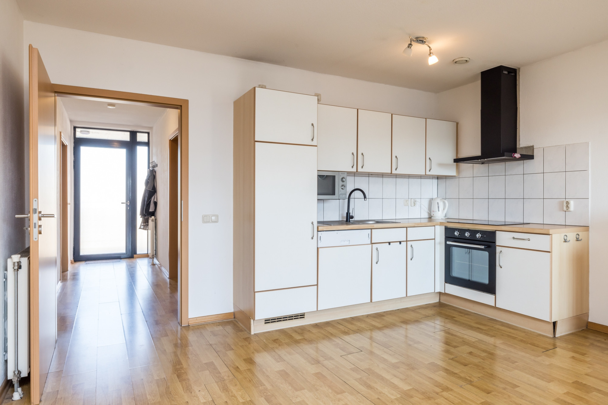 In de open keuken (3,91 x 2,88 mtr.) vinden we een mooie moderne keukenopstelling. De keuken is voorzien van veel kastruimte en de volgende apparatuur: Inductiekookplaat (nieuw maart 2022), oven (nieuw maart 2022), afzuigkap en koelkast met vriezer. Op de vloer ligt een mooie laminaatvloer, die op de badkamer na, overal in het appartement gelegd is. De ruime woonkamer met een afmeting van ca. 32m2 heeft een speels model.