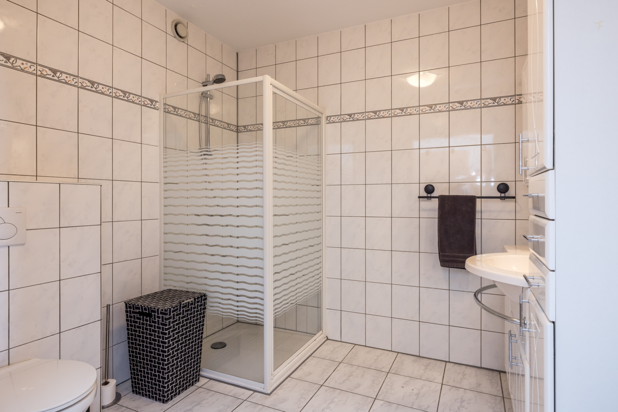 De badkamer is geheel betegeld en voorzien van een douche met glazen douchecabine, een wastafelmeubel met kasten en een wandcloset.