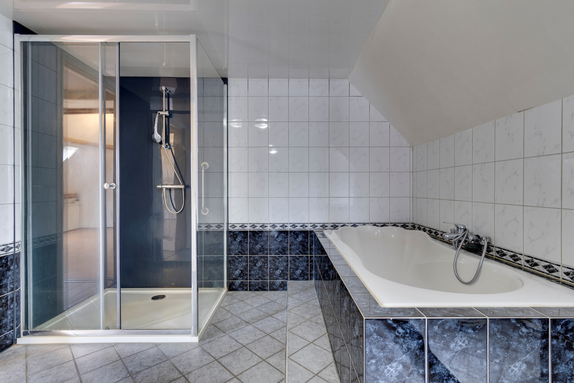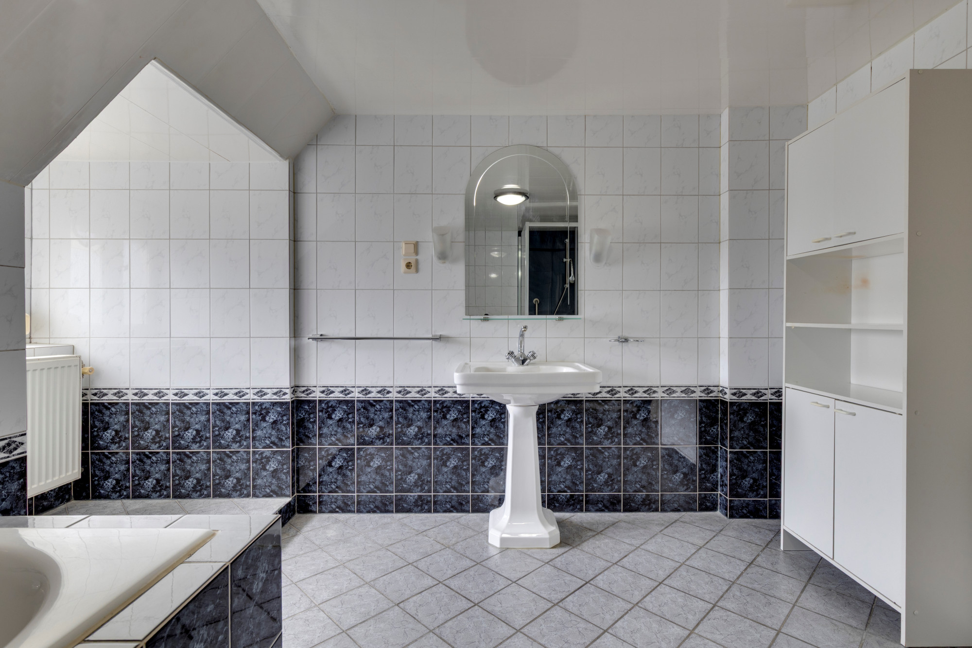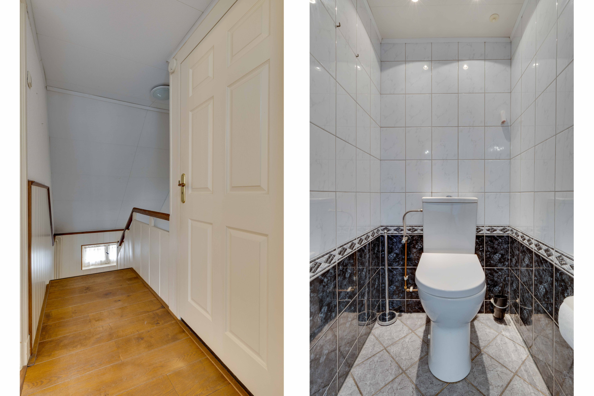 Overloop v.v. laminaatvloer, betegelde toiletruimte, ruime geheel betegelde nette badkamer v.v. inloopdouche, ligbad en vaste wastafel.