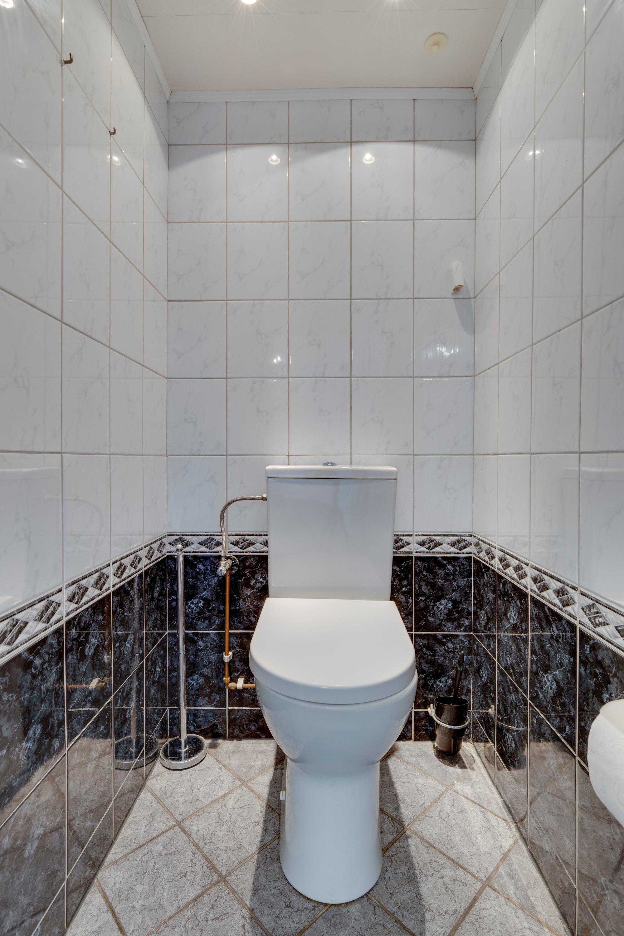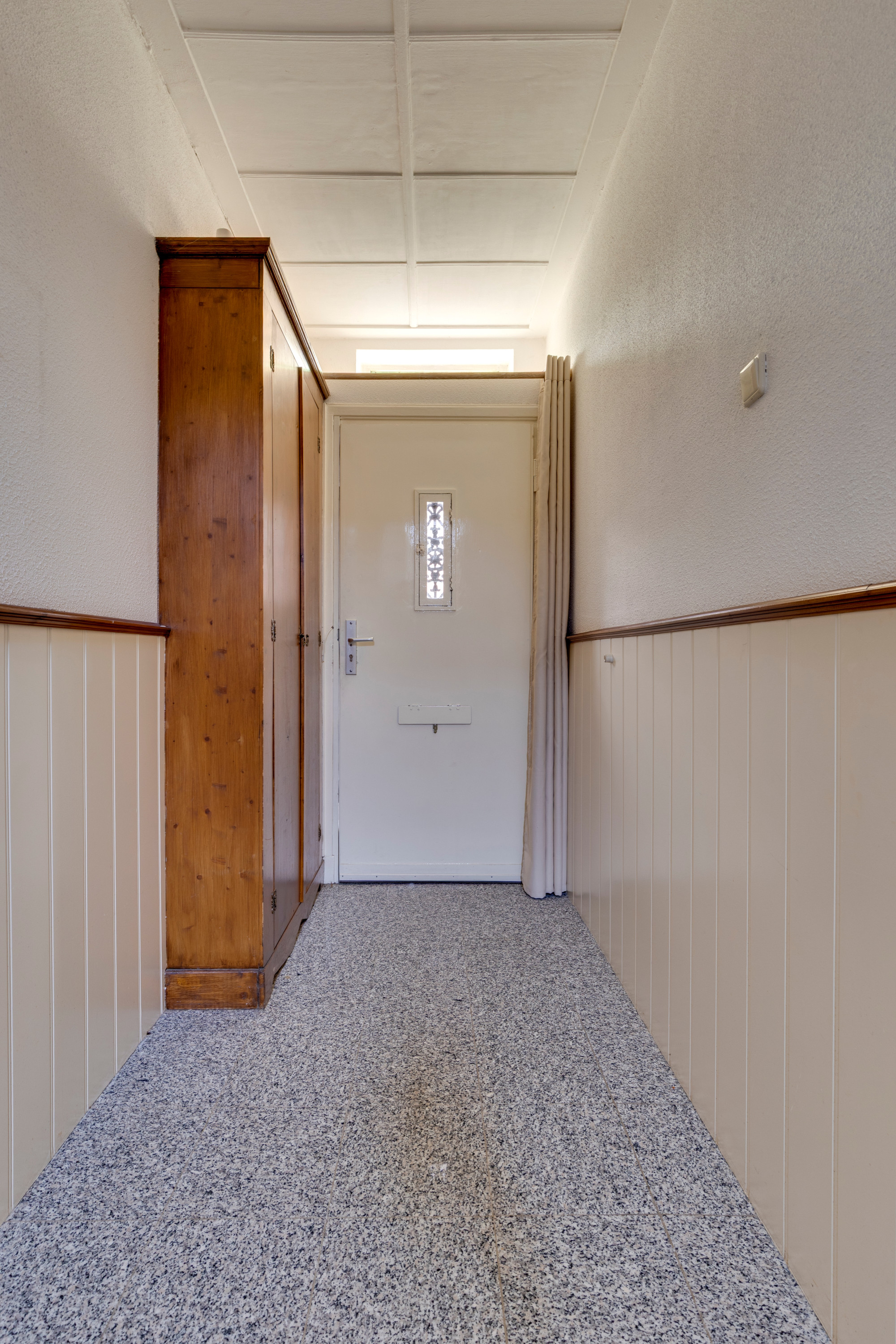 Ruime hal/entree v.v. granieten plavuizenvloer, meterkast en betegelde toiletruimte alsmede de trap naar de 1e verdieping.