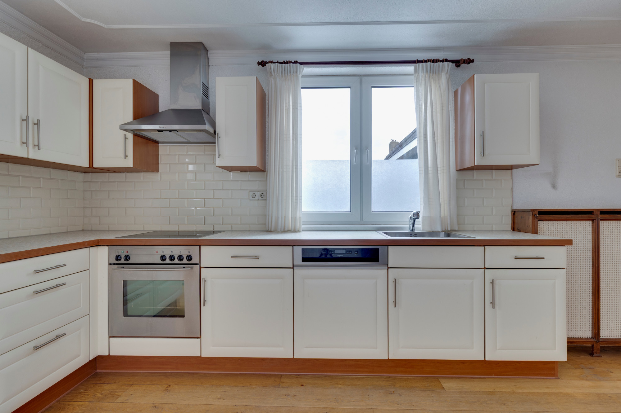 Overloop v.v. laminaatvloer, L-woonkamer v.v. parketvloer en open keuken met aanbouwinstallatie inclusief inbouwapparatuur, te weten, oven, koelkast, vaatwasser afzuiging en keramische kookplaat. Vanuit de keuken heeft men toegang tot het gezellige gedeeltelijk overdekte dakterras v.v. houten vlonderplanken.