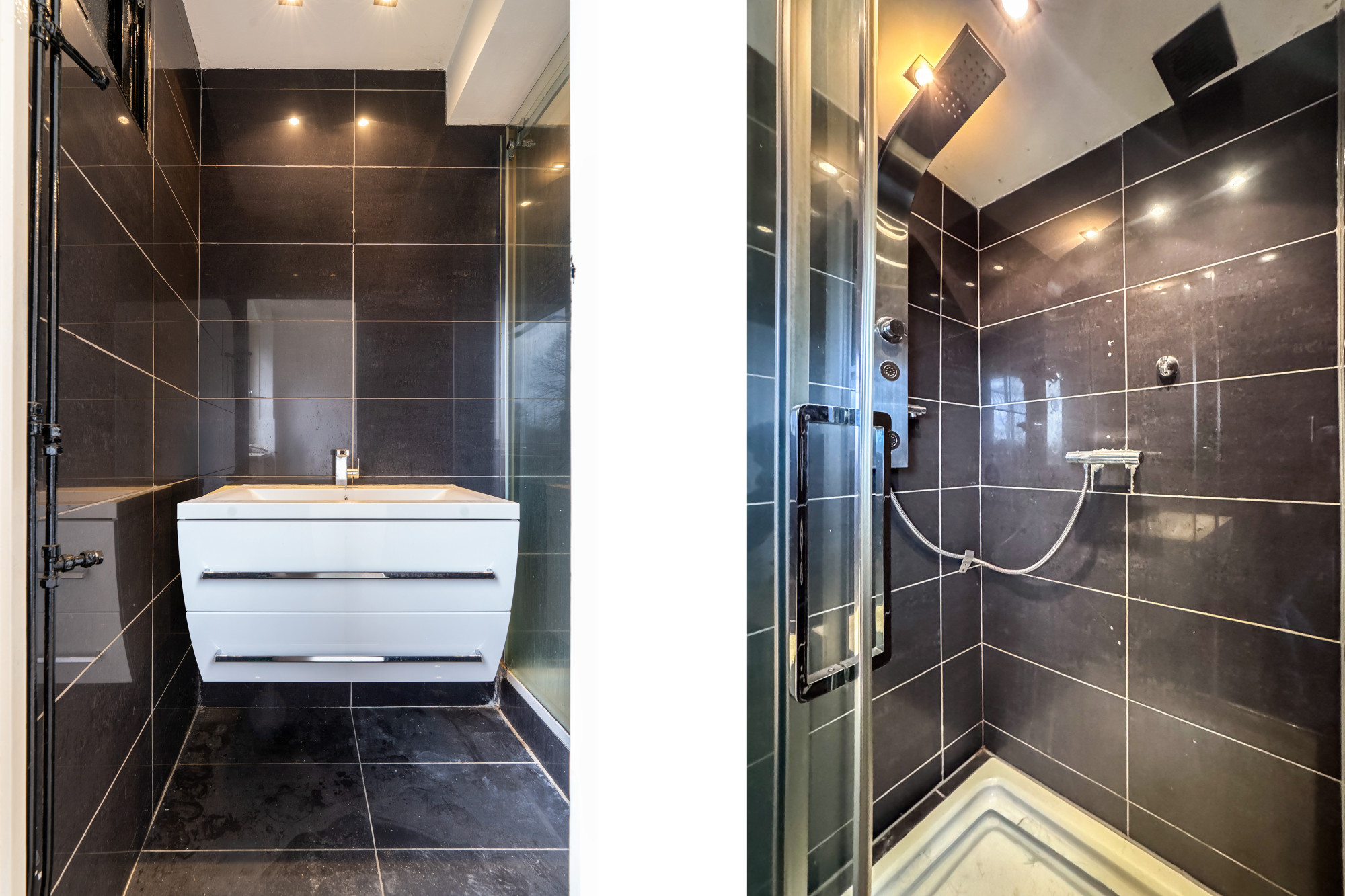 (ca. 1.98 x1.15 m) met een douche en vaste wastafel.