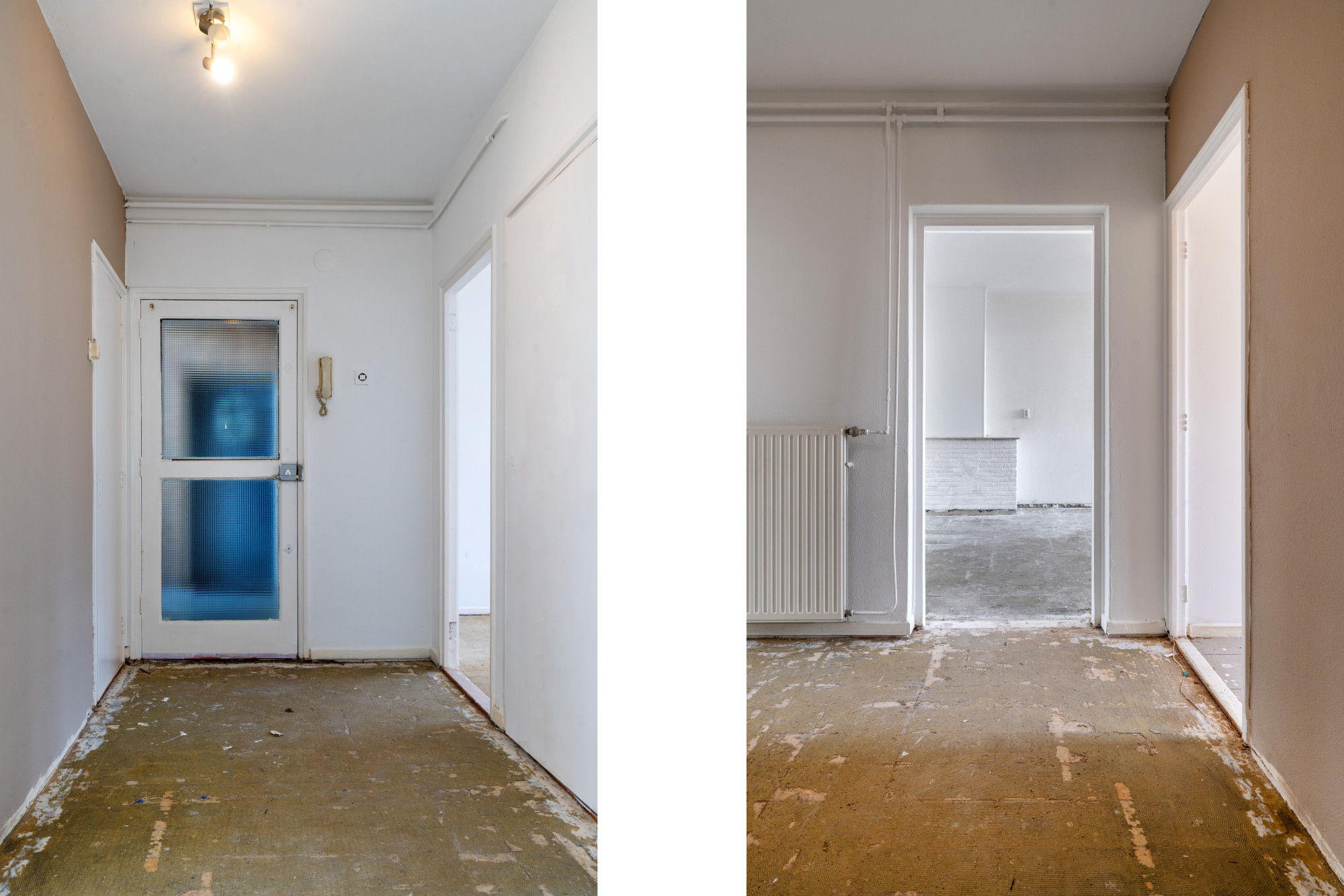 Ruime hal/entree (ca. 3.10 x 1.70 m) met meterkast en toegang tot de betegelde toiletruimte met staand closet, woonkamer en de 2 slaapkamers.