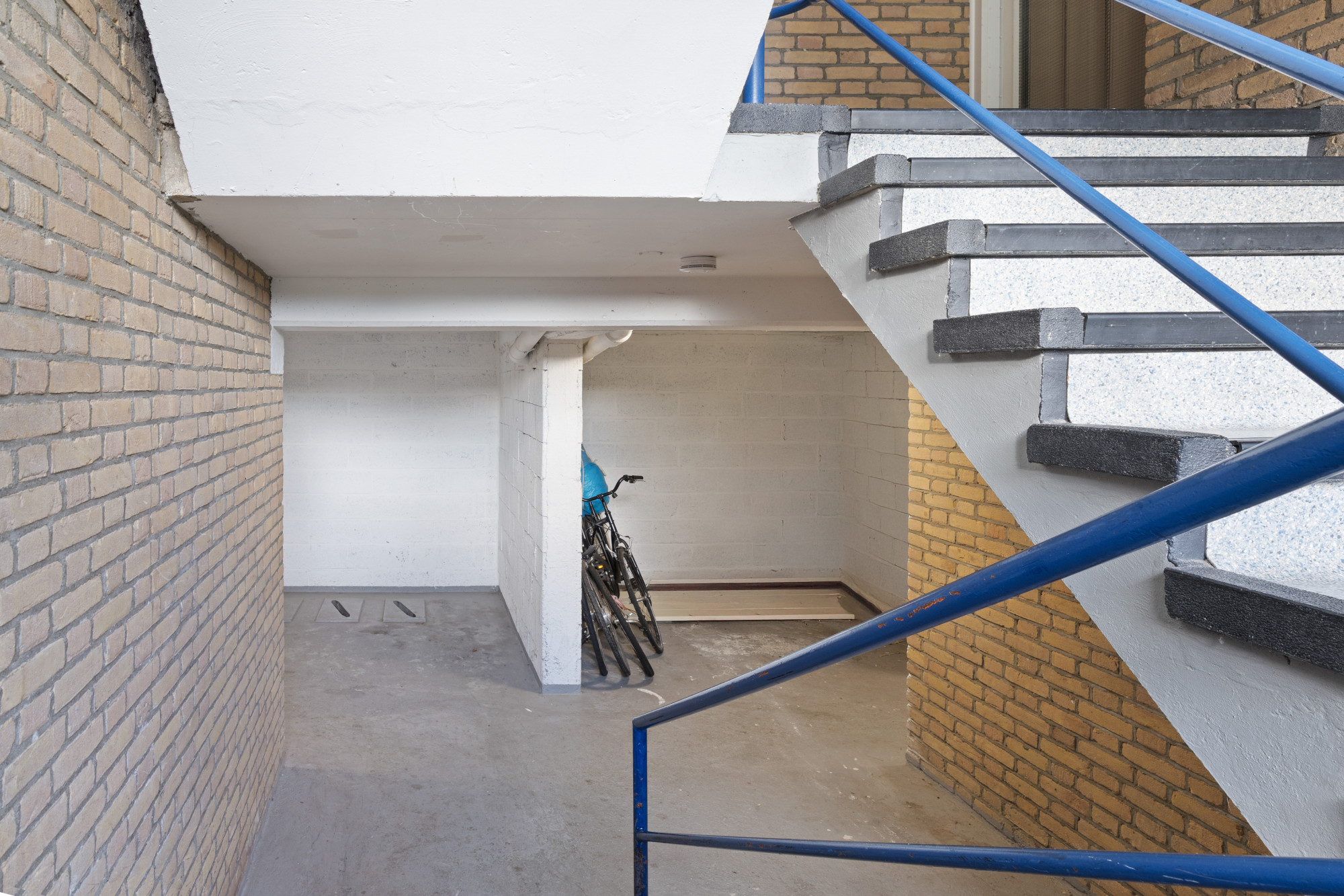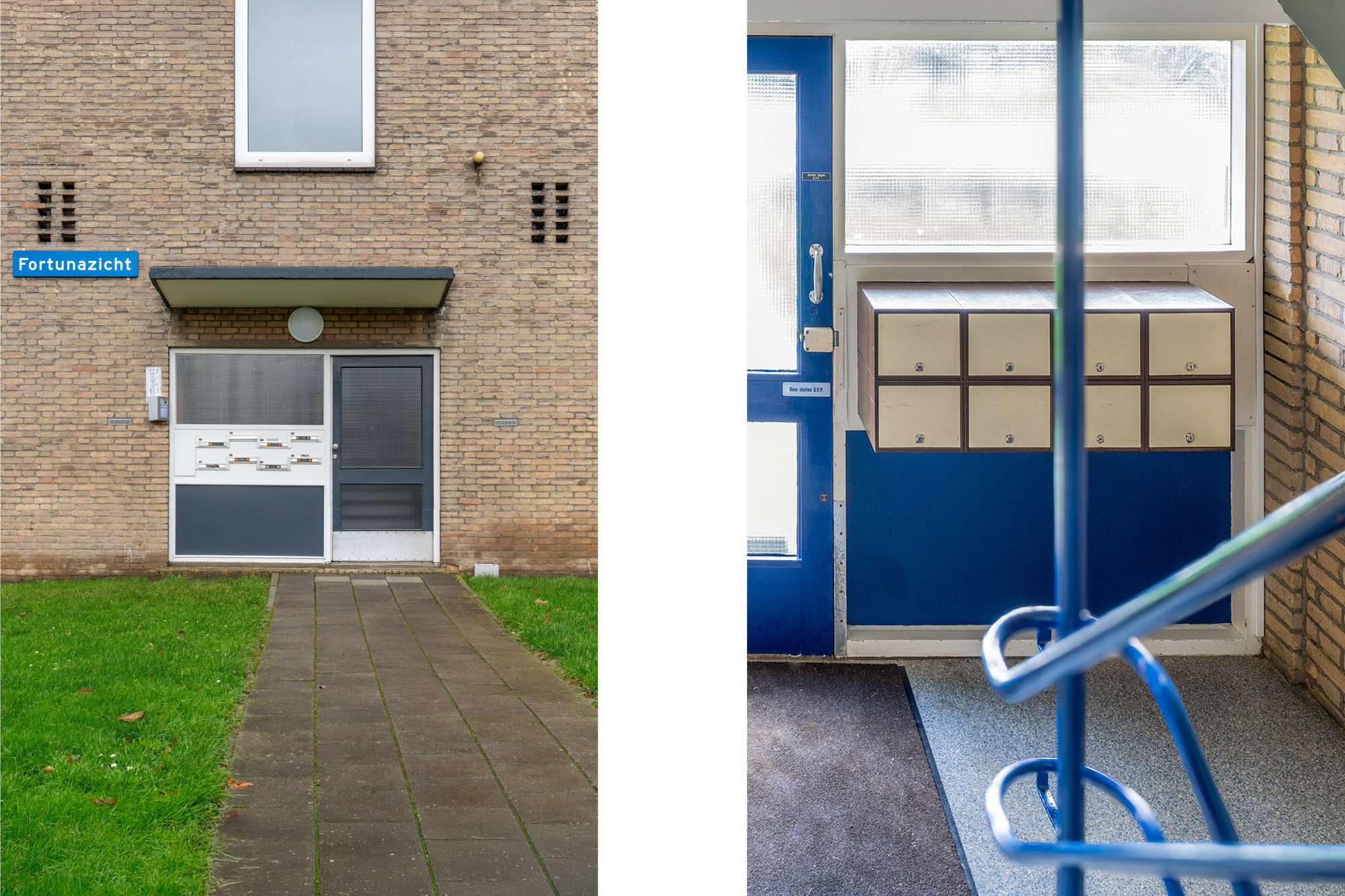 Gezamenlijke entree met intercominstallatie, trappenhuis en bellentableau.