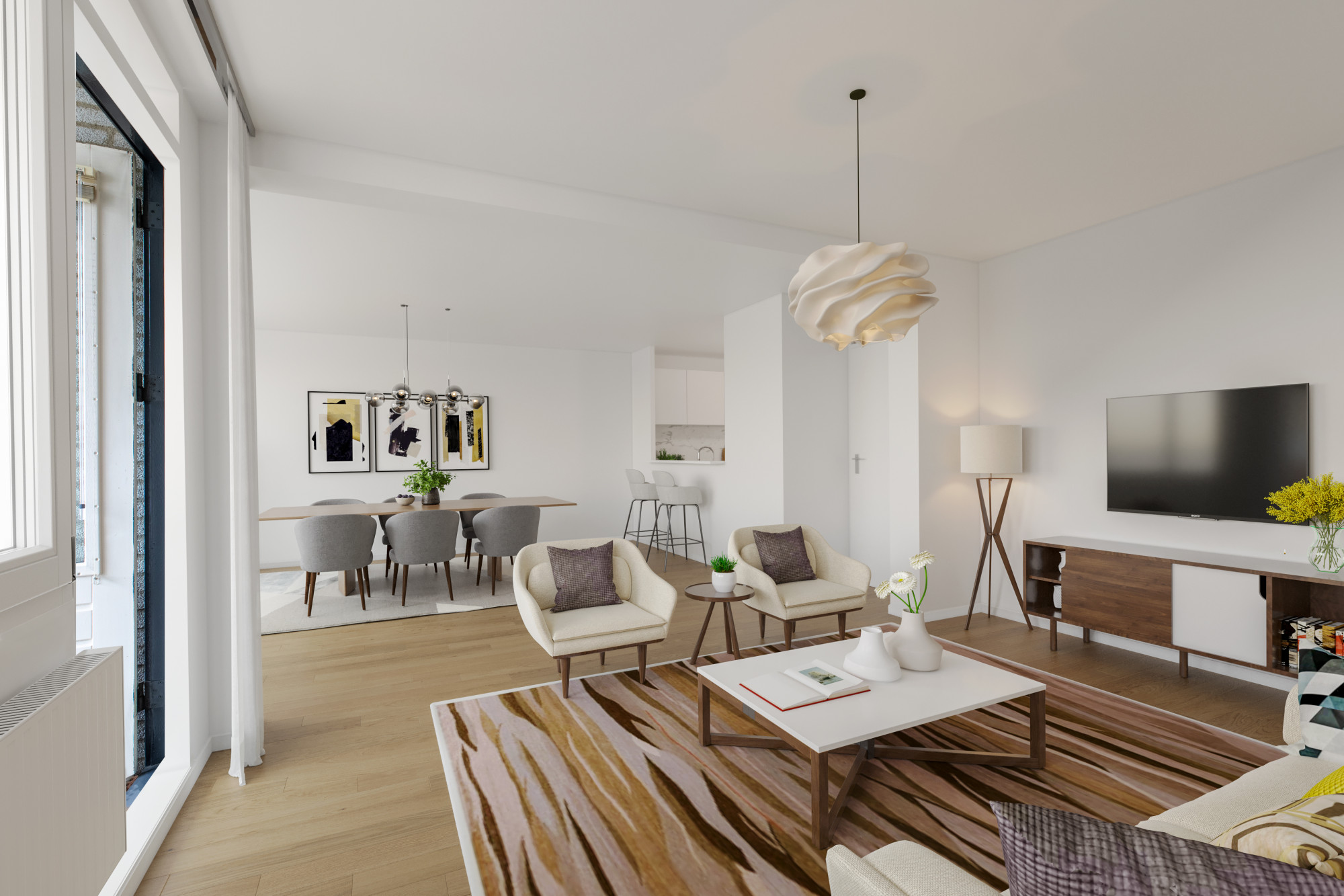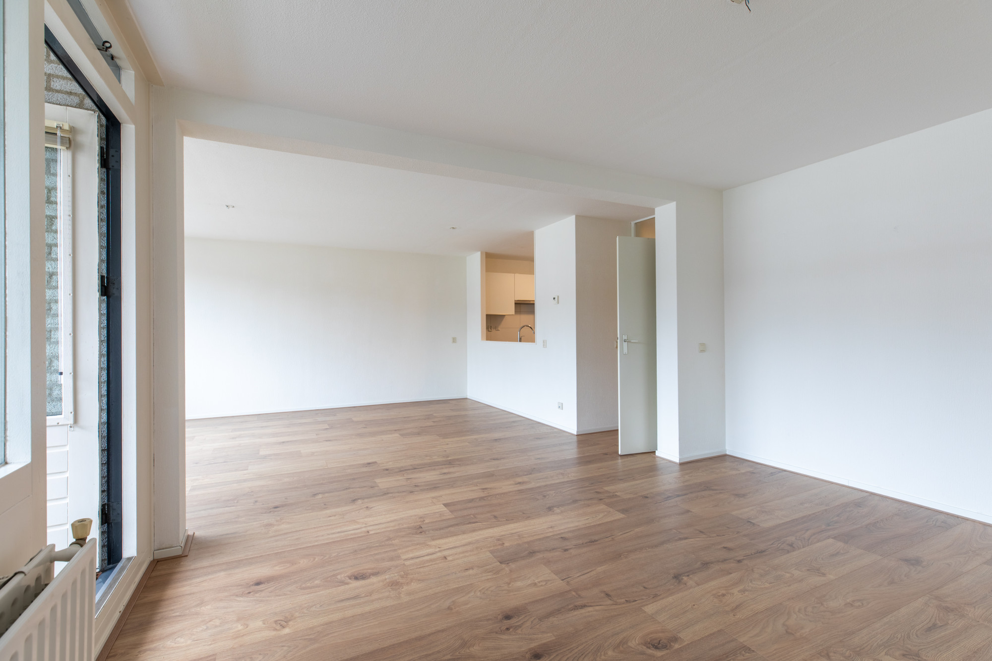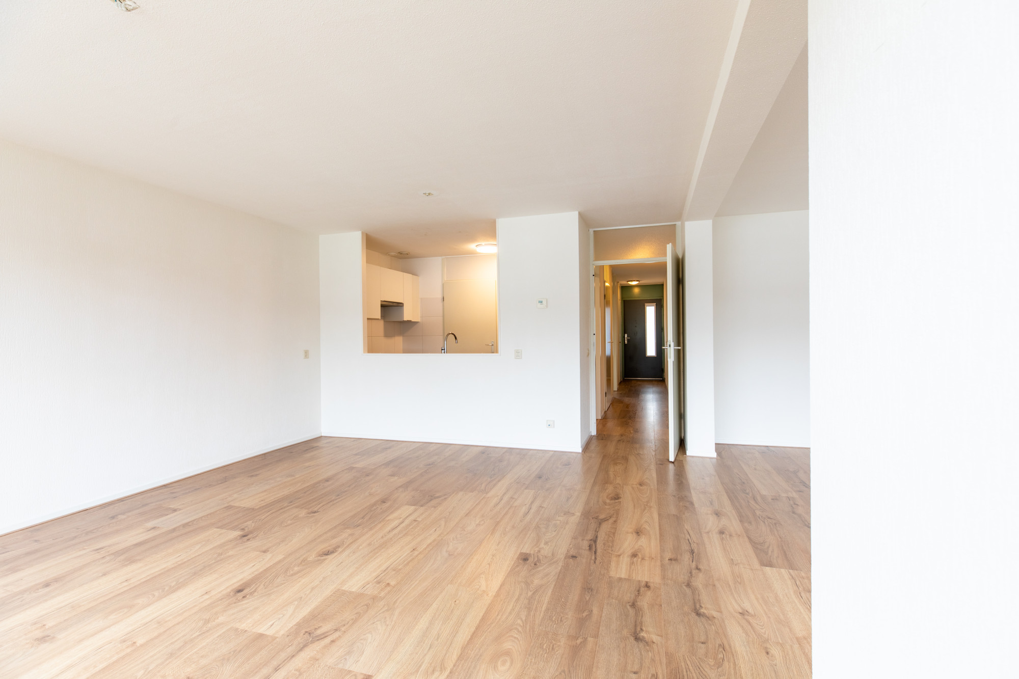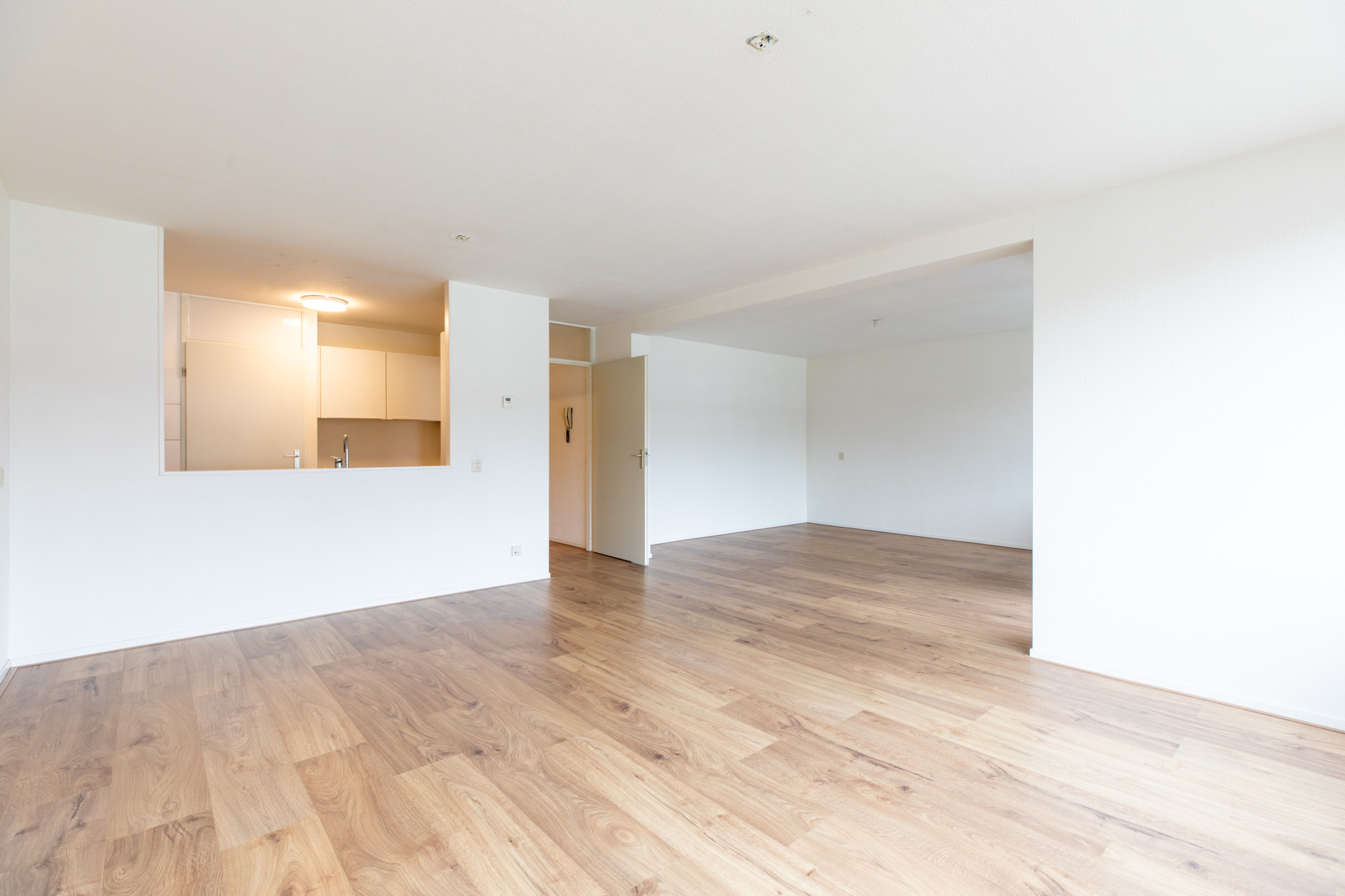 Woonkamer (circa 37 m²) met toegang tot het balkon (circa 3,08 x 1,64 m) met uitzicht op pleintje.