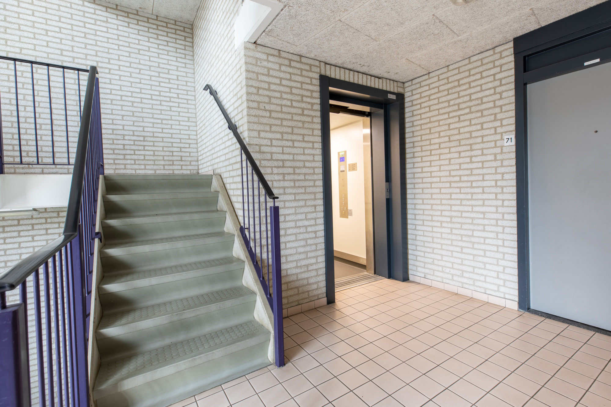Centrale hal met brievenbussen, bellentableau, intercom, trappenhuis en lift.