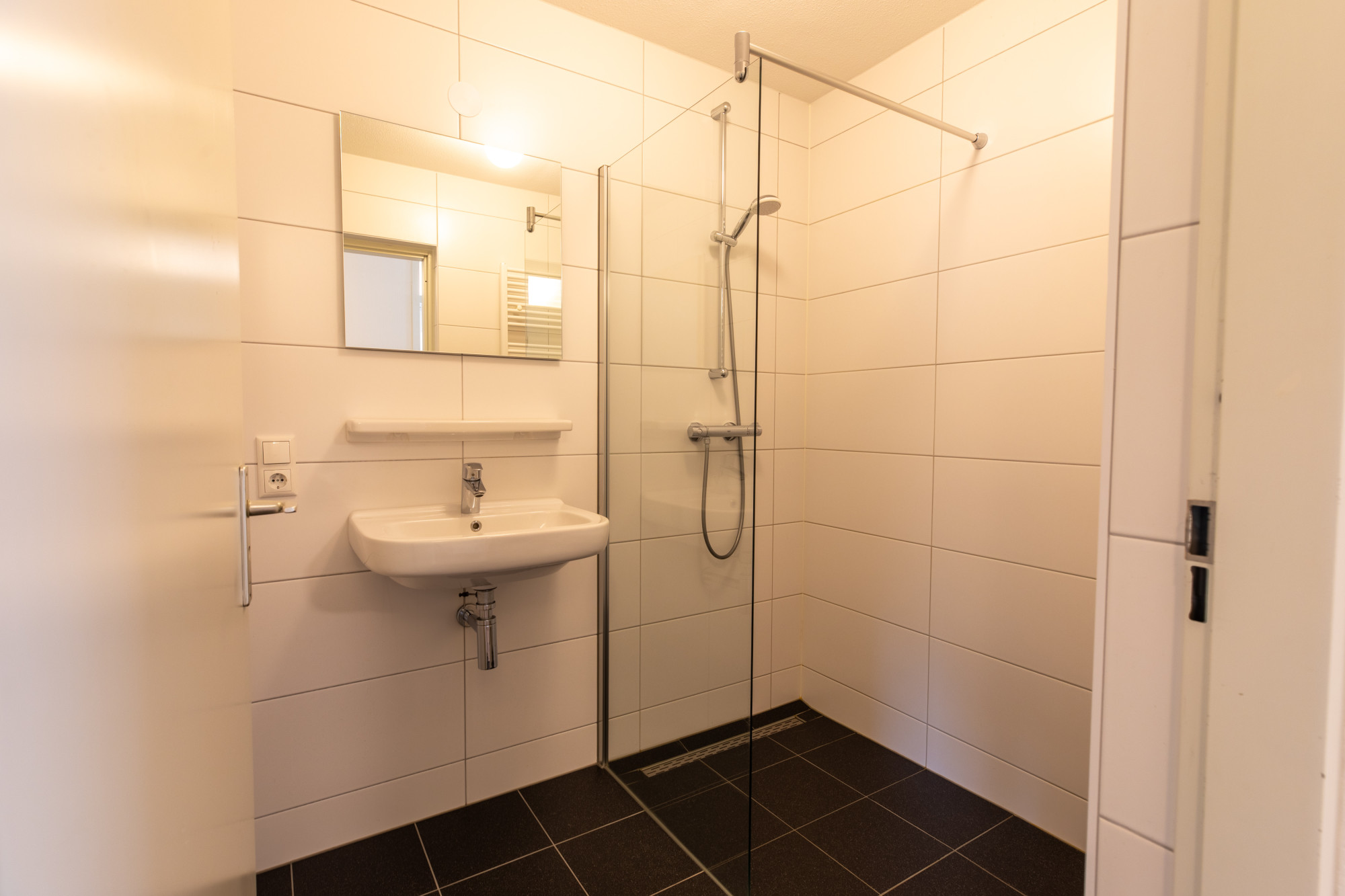 Moderne badkamer voorzien van inloopdouche en wastafel.