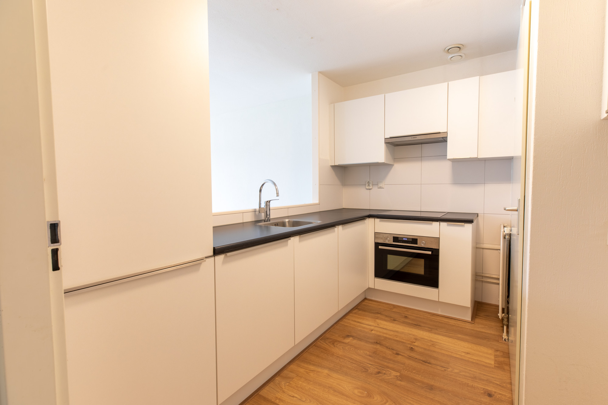 Keuken (circa 3,06 x 2,33/1,80 m) voorzien van L-vormige inrichting met ingebouwde inductiekookplaat, recirculatie afzuigkap, vaatwasser en koel-/vriescombinatie.