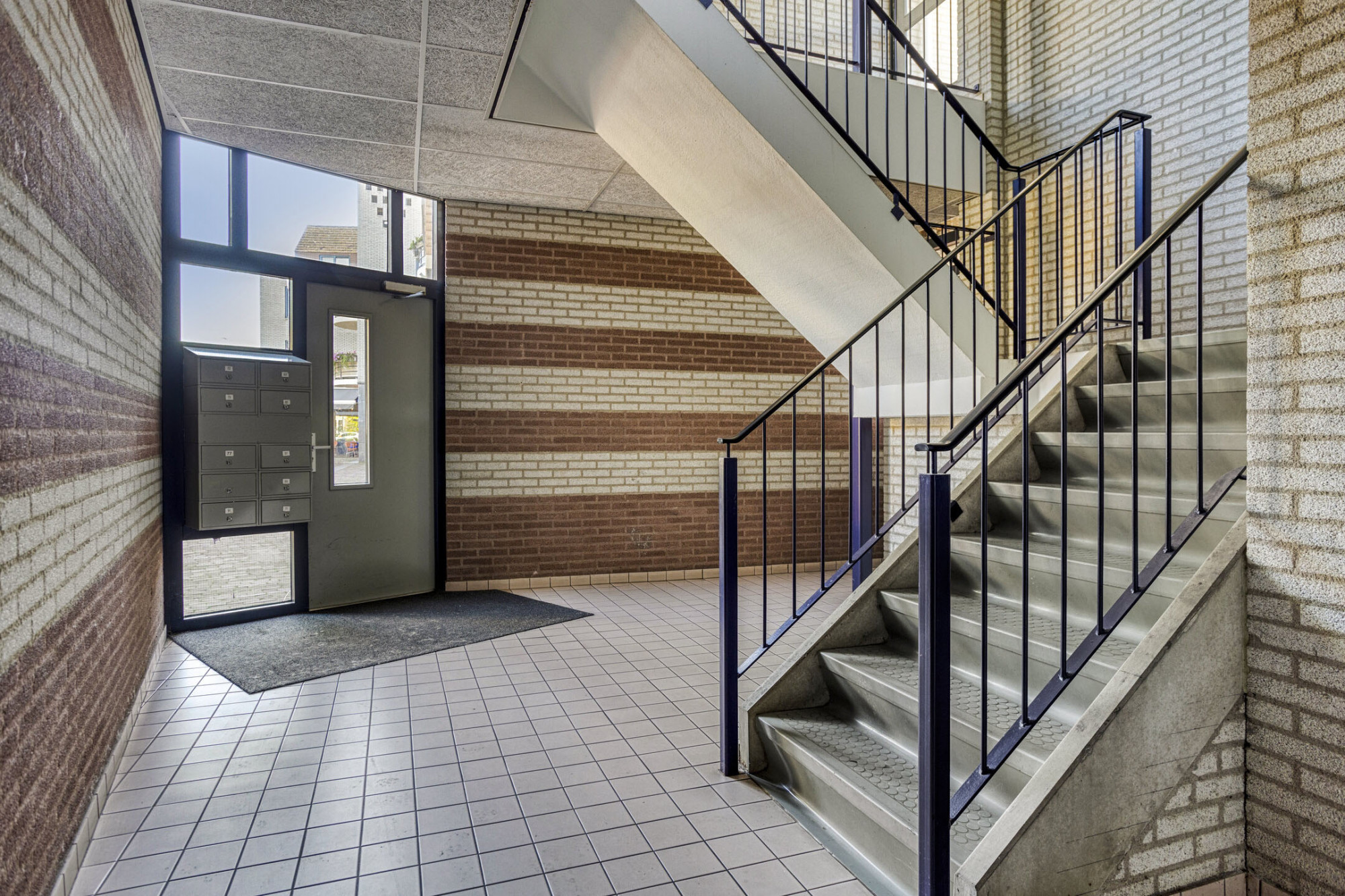 Centrale hal met brievenbussen, bellentableau, intercom, trappenhuis en lift.
