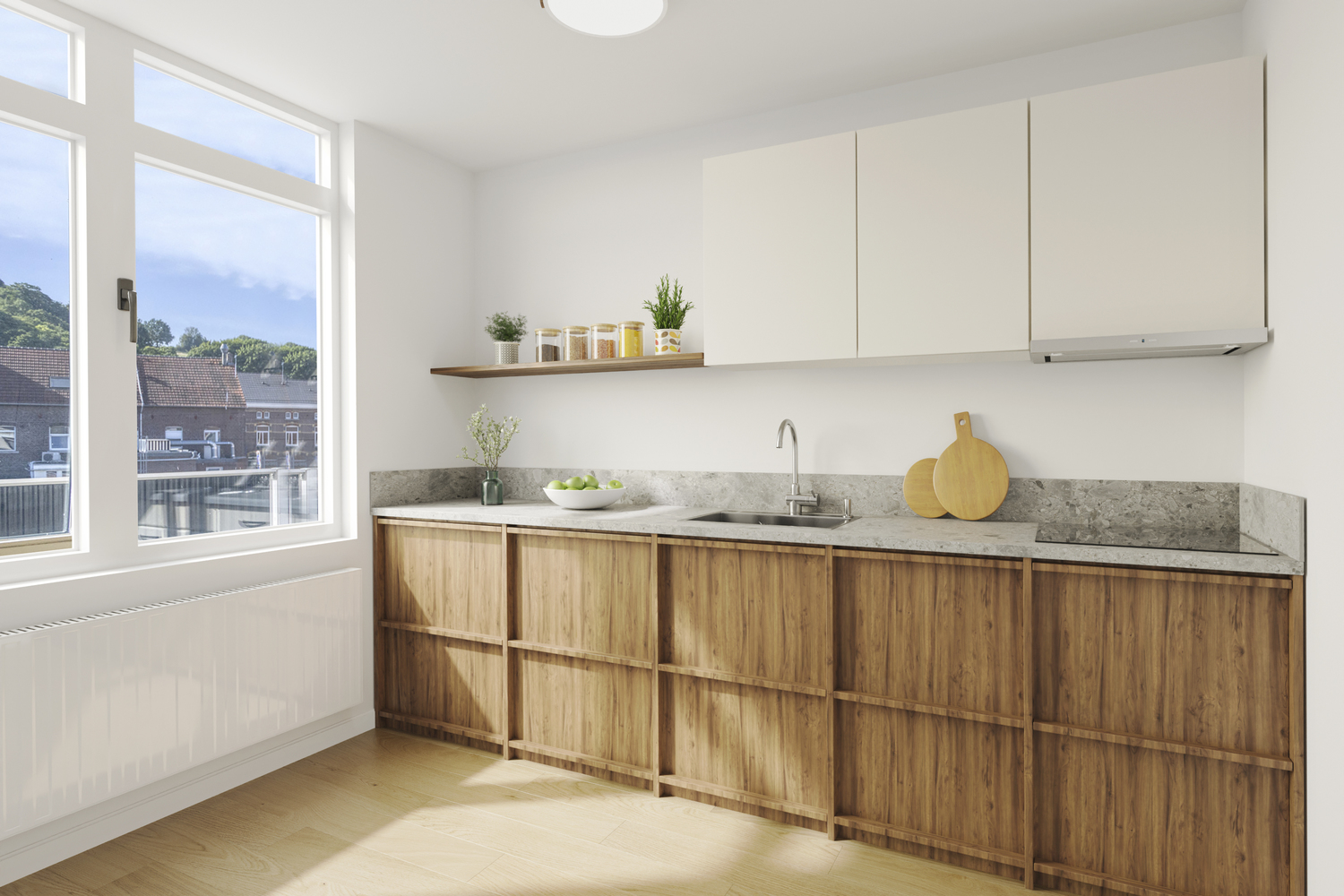 Aan de galerijzijde gelegen gesloten keuken (circa 3,00 x 2,64 m) voorzien van eenvoudige rechte opstelling met ingebouwde recirculatie afzuigkap.