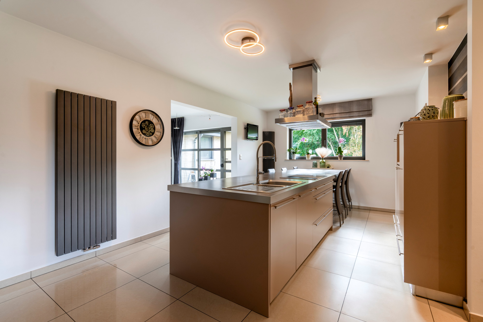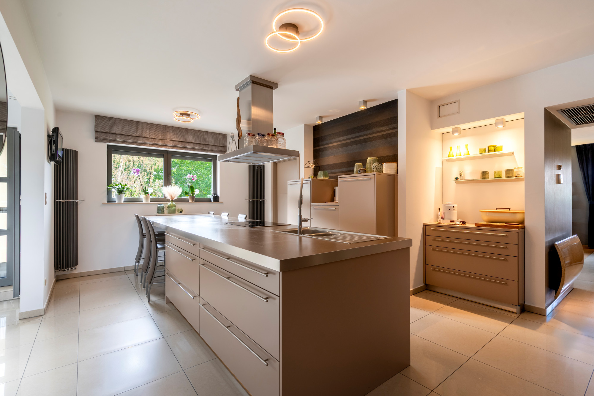 The kitchen is fully equipped with custom-made cabinets, an induction cooktop, extractor hood, oven, combination oven, two refrigerators, and a dishwasher.