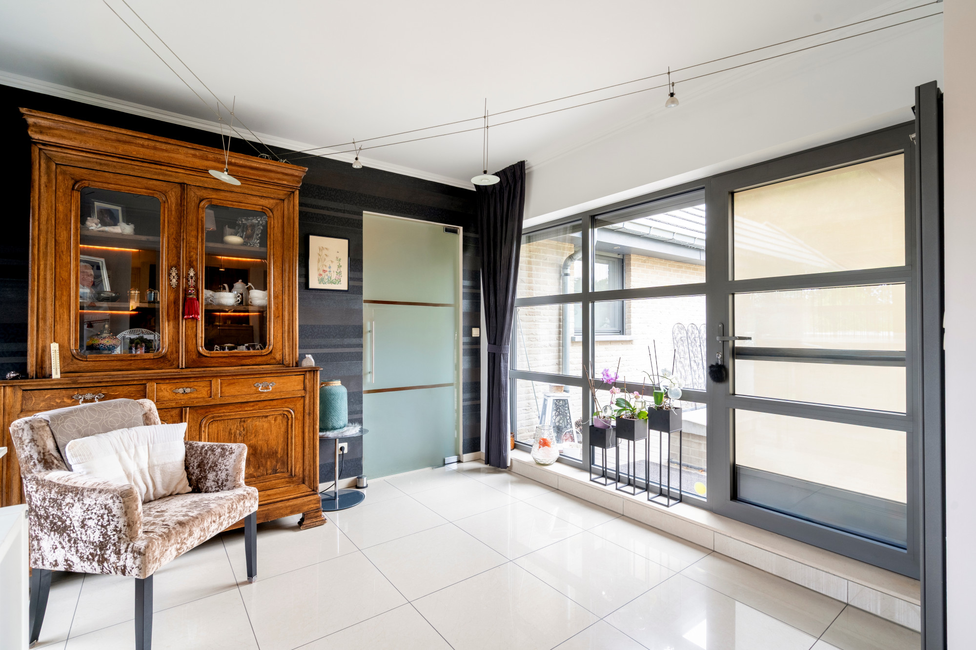 The entrance hall, featuring a cloakroom and guest toilet, provides access to an office on one side and to the main living area on the other. The living space includes a spacious dining area and a cozy sitting room with a gas fireplace, seamlessly connecting to the bright, open-plan kitchen. This kitchen is fully equipped with custom-made cabinetry. Adjacent to the kitchen is a convenient storage room and direct access to the elevator. There is also a large laundry room with a shower that leads to the outdoor jacuzzi — the perfect spot for relaxation.