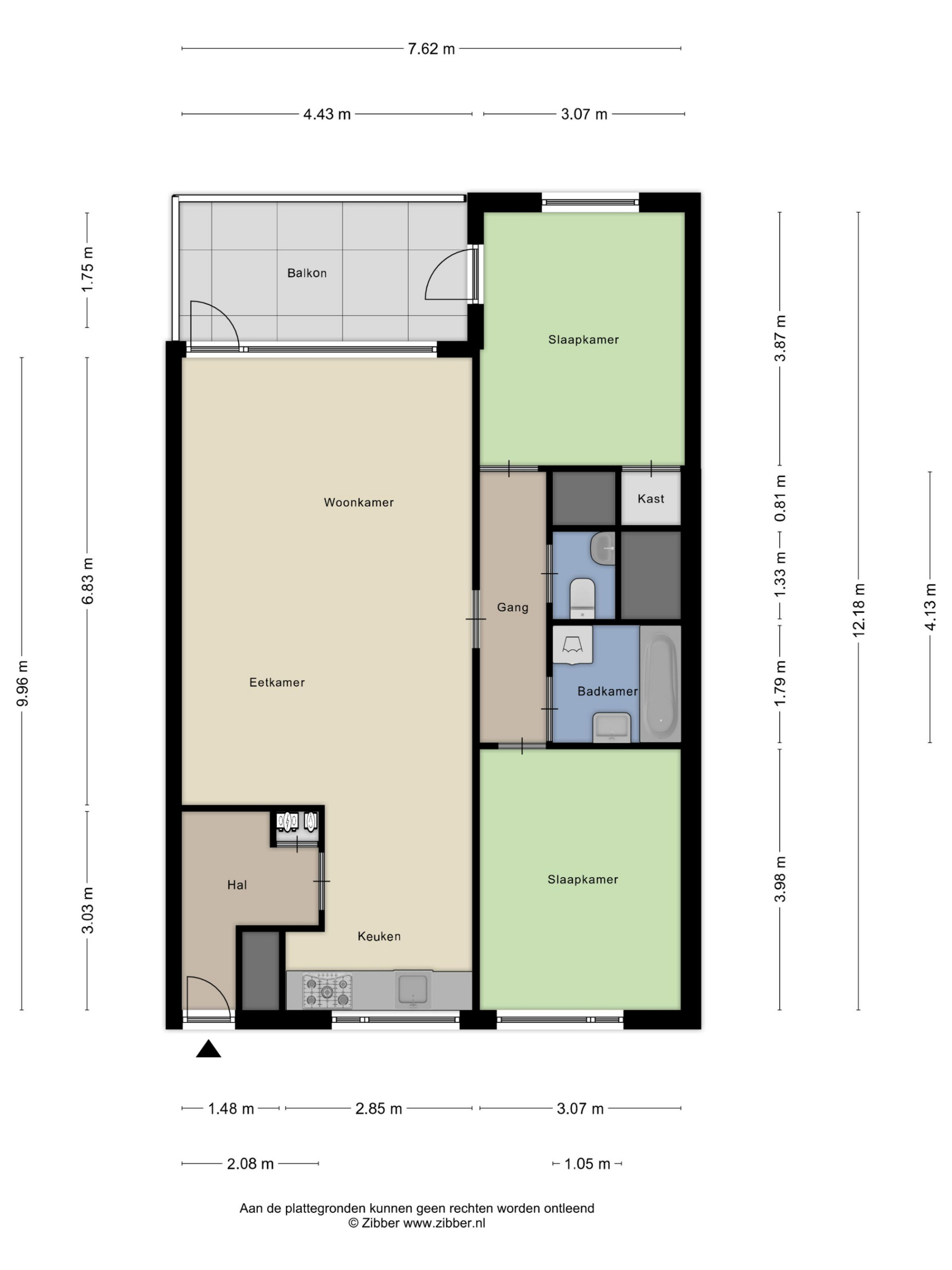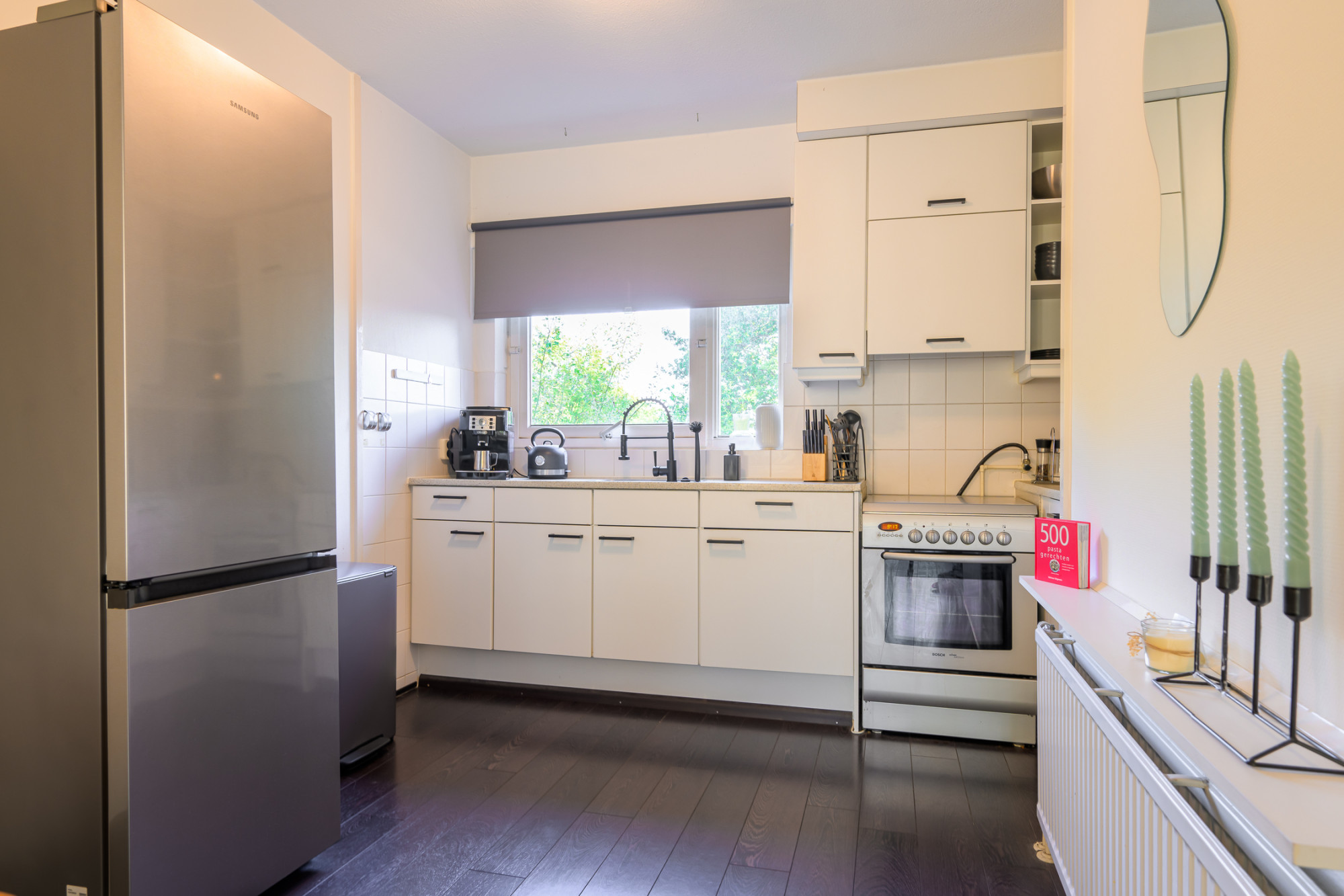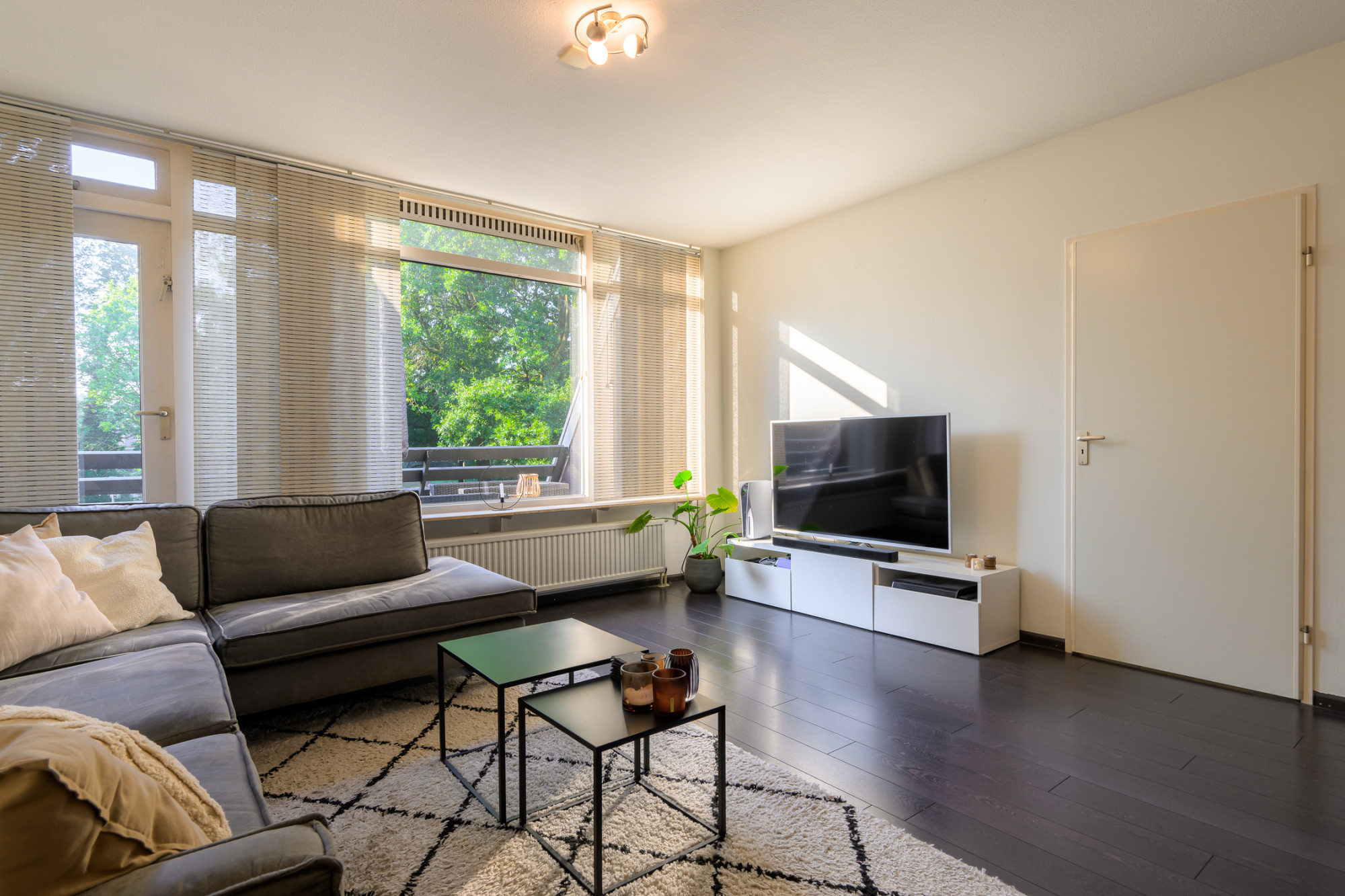 Via de hal gaat u naar de woonkamer en keuken. De woonkamer is circa 5,22m x 4,43m groot. Aan de achterzijde is toegang tot het balkon van circa 4,43m x 1,75m. De keuken is aan de voorzijde van het appartement en is circa 3,03m x 2,52m groot.