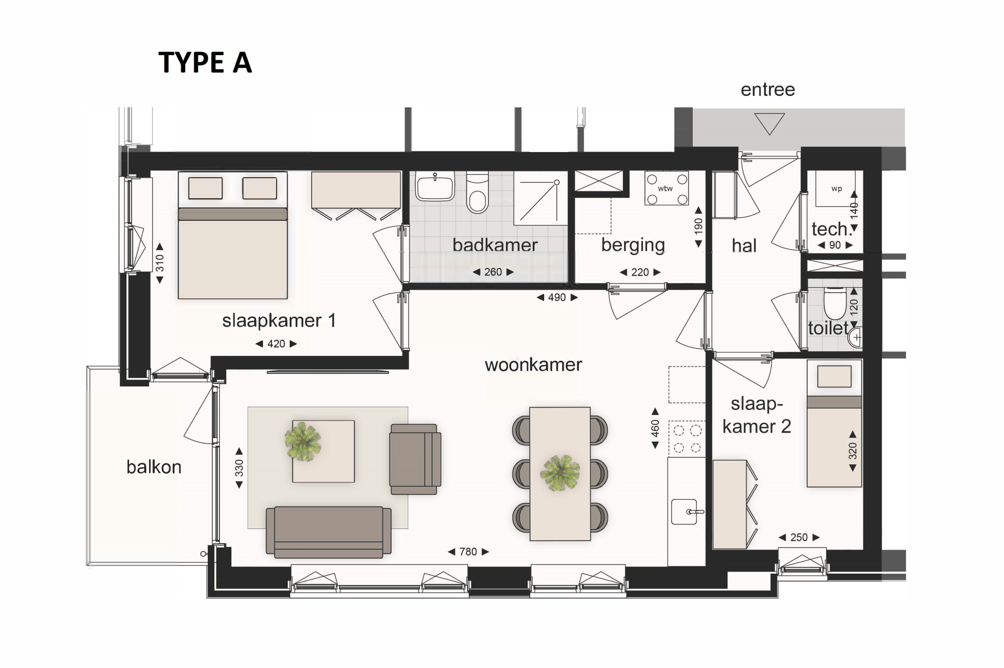 Het kleinschalige appartementencomplex bestaat uit 12 appartementen en twee penthouses. De begane grond voorziet in een centrale entree met lift, centraal trappenhuis en brievenbussen. Daarnaast zijn hier twee fietsenkelders en de inpandige bergingen gesitueerd. Parkeren is op het privé buitenterrein voorzien. Iedere appartement is praktisch ingedeeld, energiezuinig en uitstekend geïsoleerd en beschikken over een energielabel A+++. Daarnaast is hier rekening gehouden met de wensen van jonge mensen, die op zoek zijn naar een fijn startersappartement én mensen op leeftijd, die juist iets kleiner willen wonen. Alle appartementen hebben een comfortabele indeling en vallen in de categorie betaalbare koop. De appartementen, gelegen op verdieping 1, 2 en 3, zijn efficiënt ingedeeld. Er zijn twee verschillende type appartementen, van respectievelijk circa 72 en 73 m2 groot, exclusief de berging op de begane grond. Beide typen bieden een woonkamer, keuken, badkamer, twee slaapkamers, een balkon van circa 6 m2, technische ruimte en een berging. Op de begane grond beschikt ieder appartement over een privé berging en een eigen parkeerplaats.
