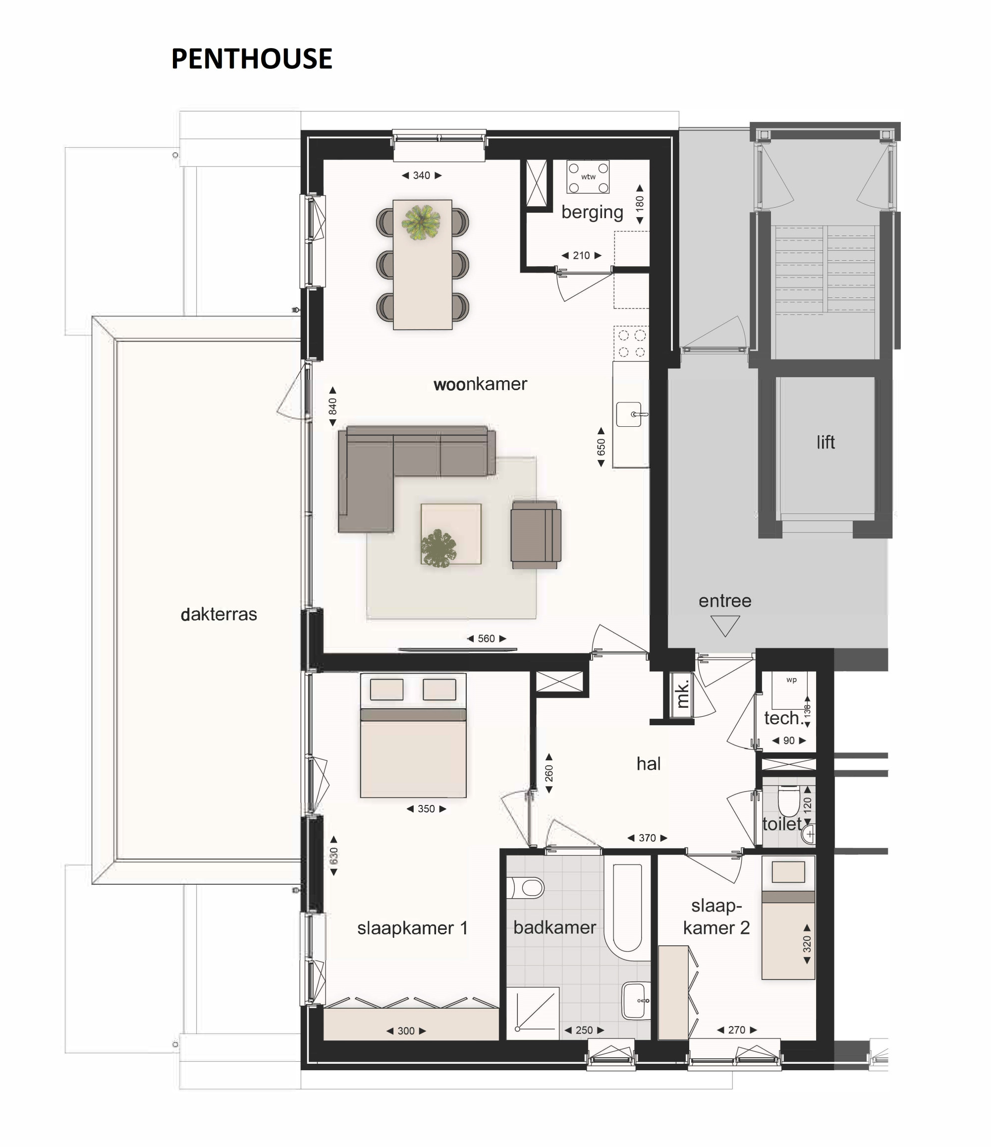 De twee penthouses zijn ieder circa 102 m2 groot (excl. berging begane grond) en bieden een woonkamer, hal, keuken, badkamer, twee slaapkamers, technische ruimte, opbergruimte en een royaal dakterras van liefst circa 27 m2 groot. Op de begane grond beschikt ieder penthouse over een zeer ruime stallingsruimte welke zowel vanaf het buitenterrein als inpandig toegankelijk is én een eigen parkeerplaats.
