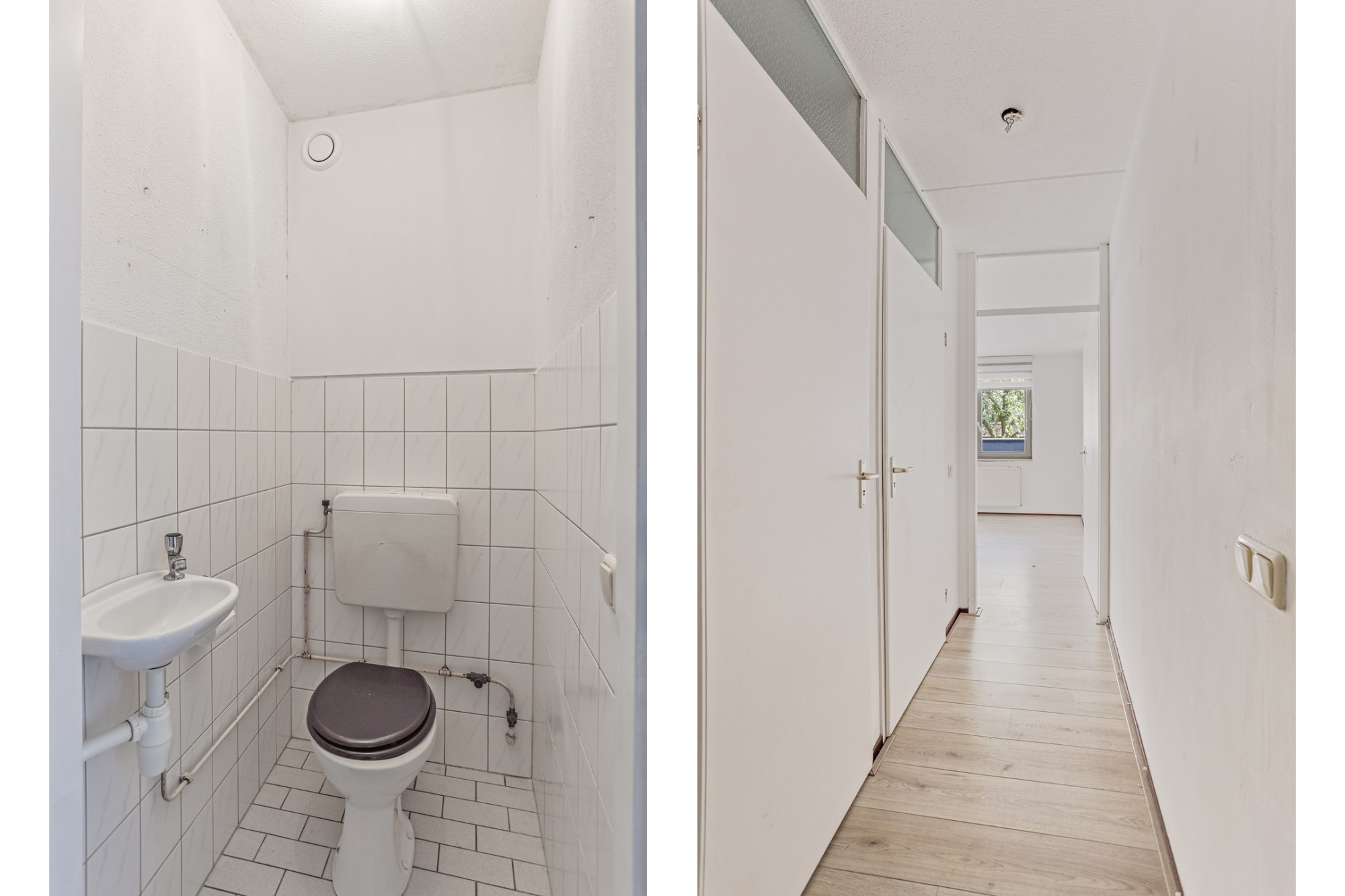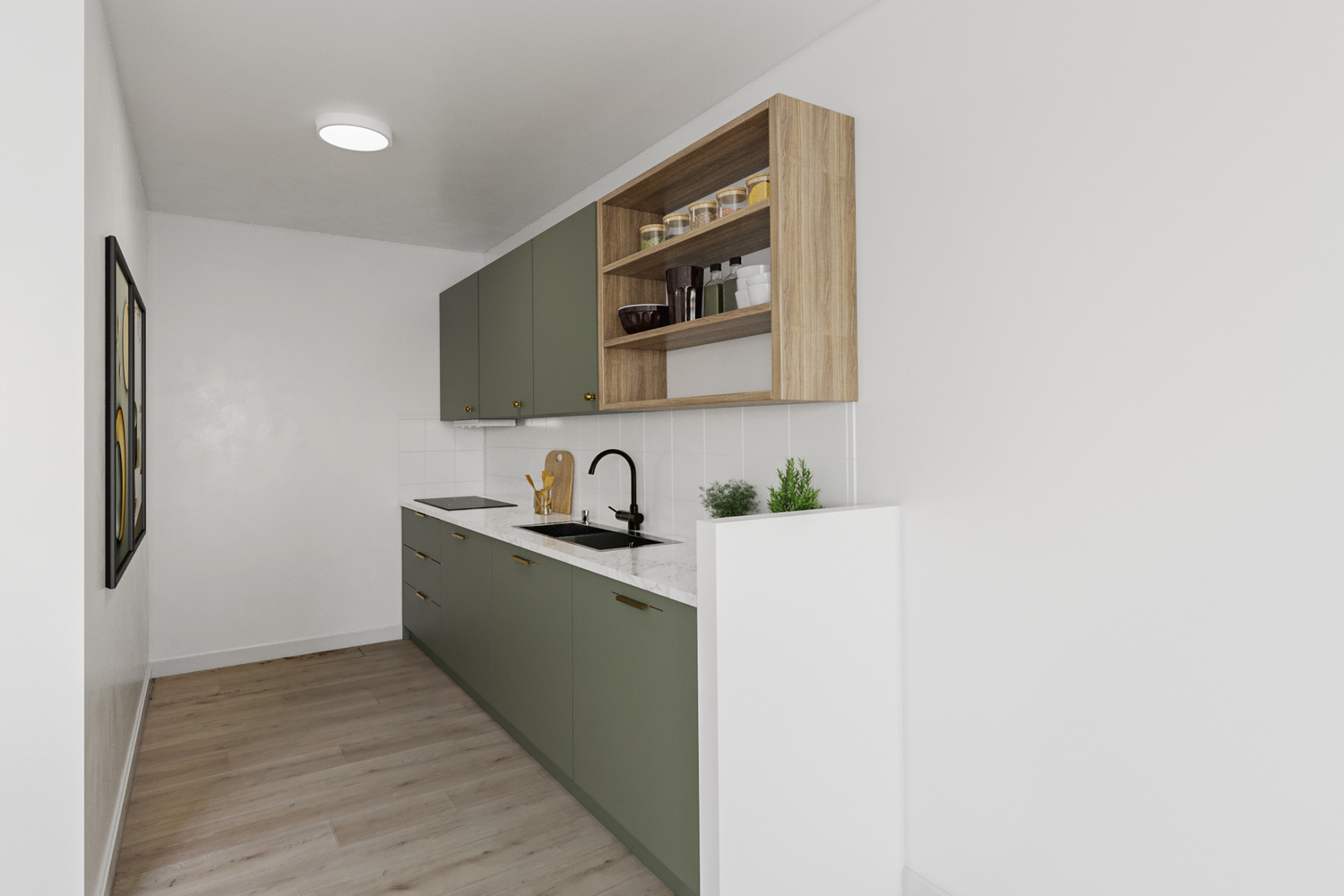 Entree, hal met techniekruimte en doorlopende laminaatvloer. Lichte woonkamer (5.38 x 5.48/2.21 m) met toegang tot het balkon (2.95 x 1.57 m) en in open verbindingen met keuken met keukenblok met diverse onder- en bovenkasten.