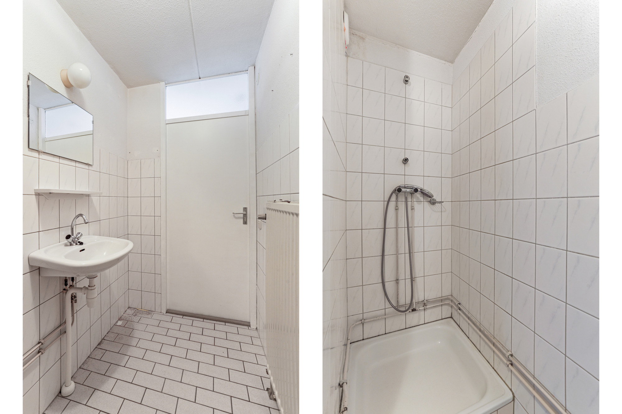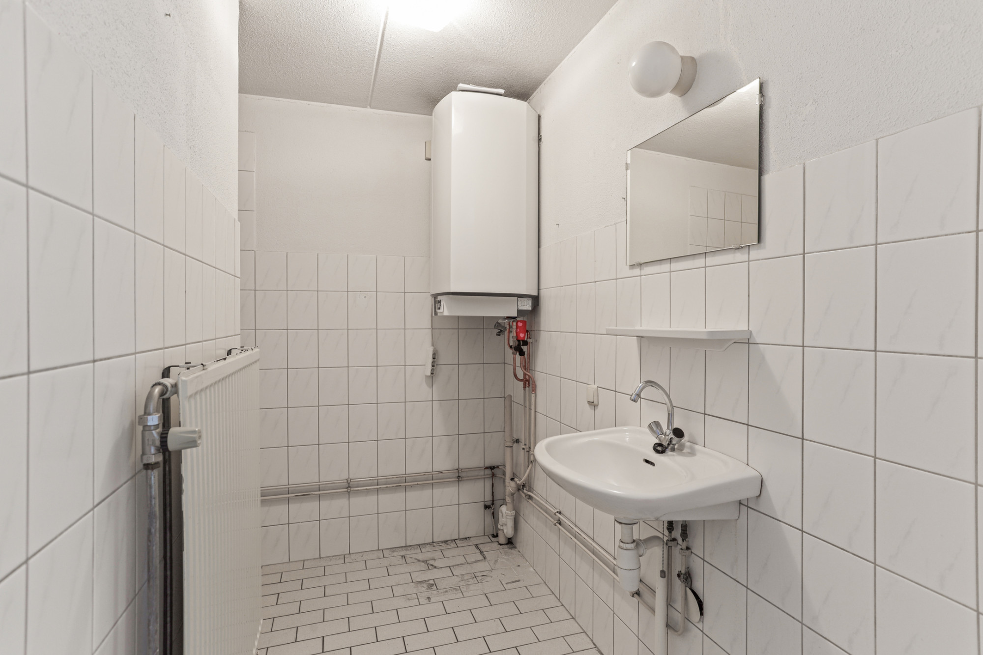 Badkamer met douche, vaste wastafel en warmwater boiler.. Separate deels betegelde toiletruimte met duoblok en fonteintje.