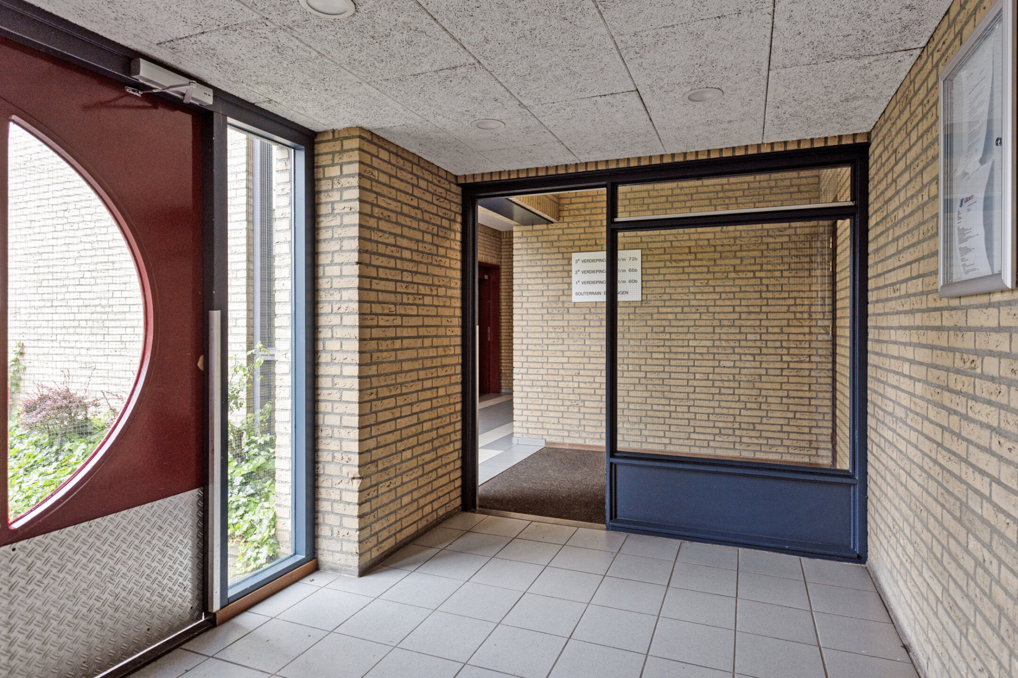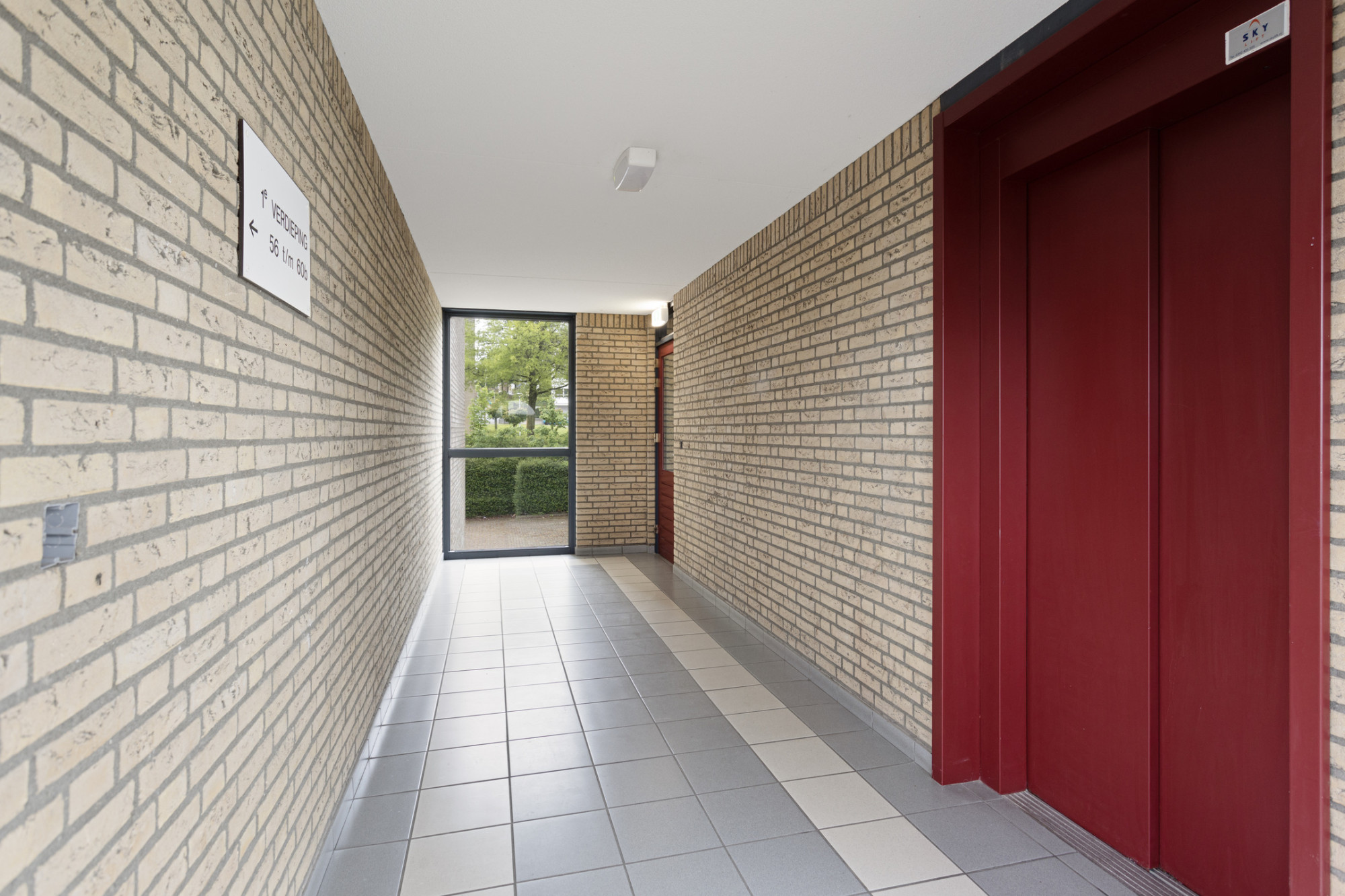 Central entree met brievenbussen, bellentableau en liftinstallatie.