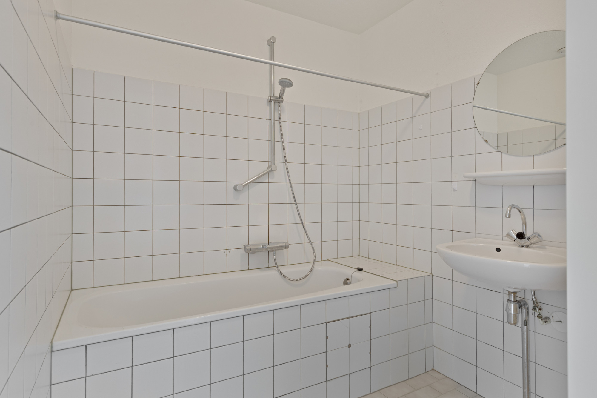 Betegelede badkamer (2.04 x 1.92 m) met ligbad en vaste wastafel.