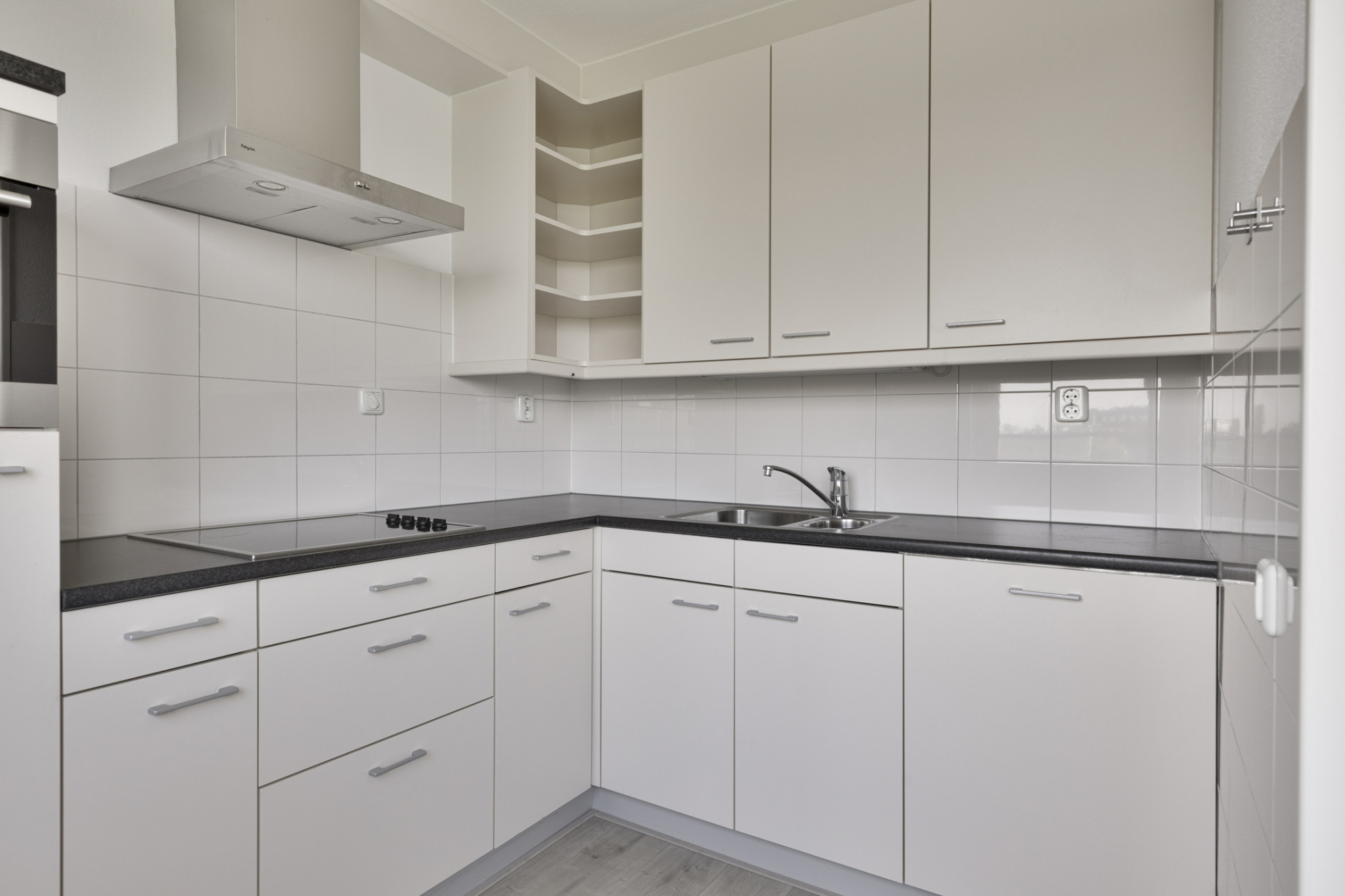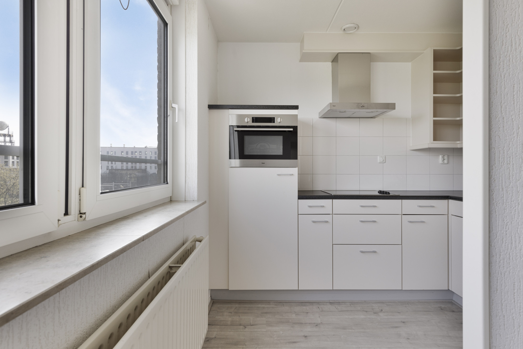 Woonkamer (5.67 x 6.09/4.95 m - totaal circa 32 m²) met toegang tot het balkon (2.23 x 2.15 m); half-open keuken met keuken installatie in hoekopstelling met diverse onder- en bovenkasten, inbouwapparatuur te weten: keramische kookplaat, afzuigkap, koelkast en vaatwasser.