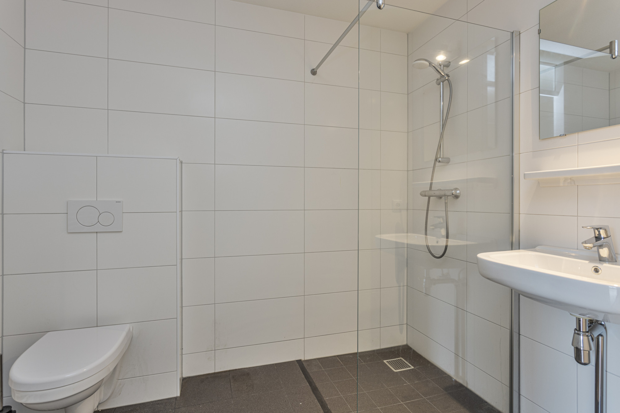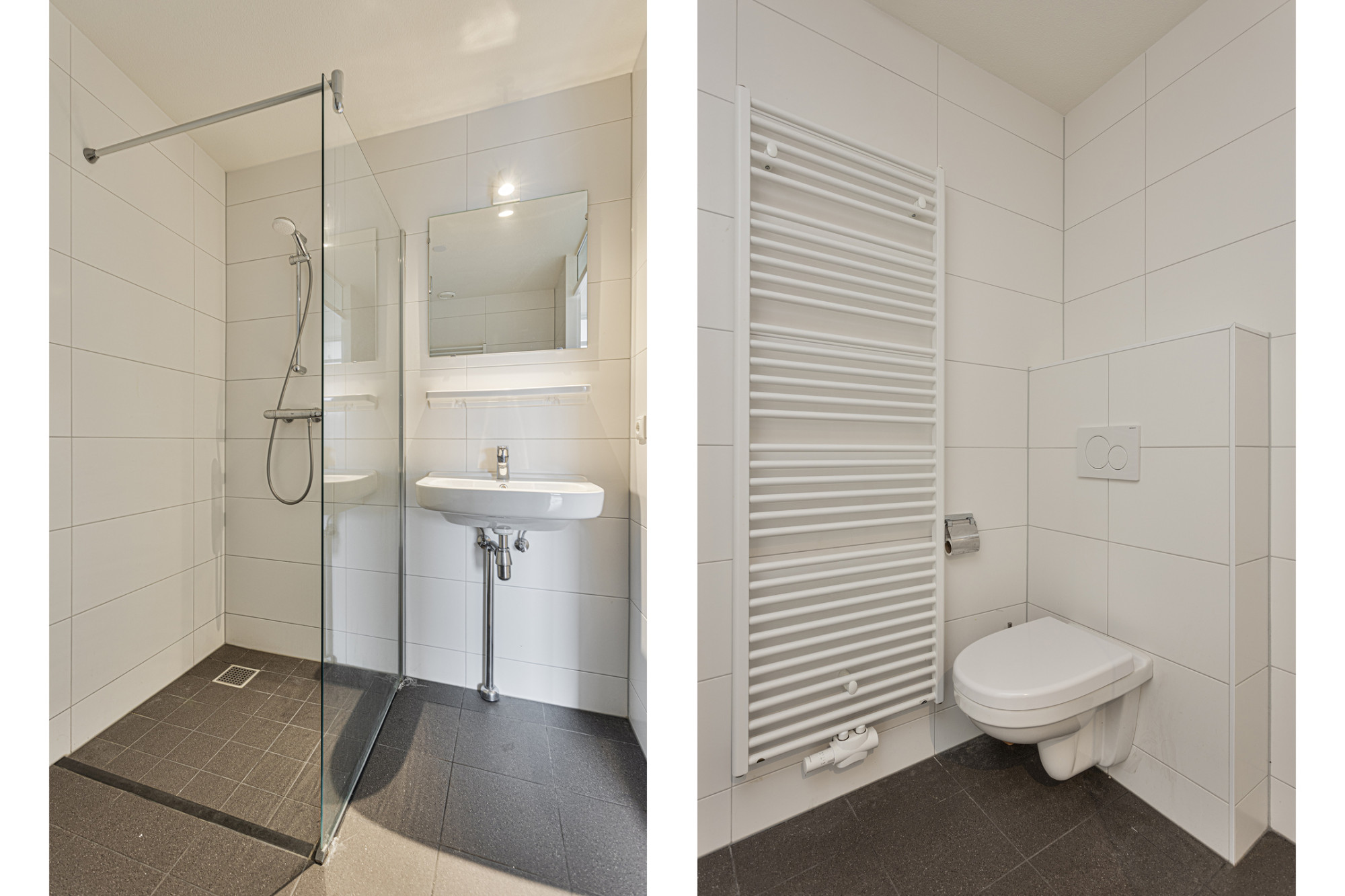 Keurige badkamer geheel betegeld met inloopdouche, vaste wastafel, designradiator, aansluitpunt wasautomaat en zwevend toilet.