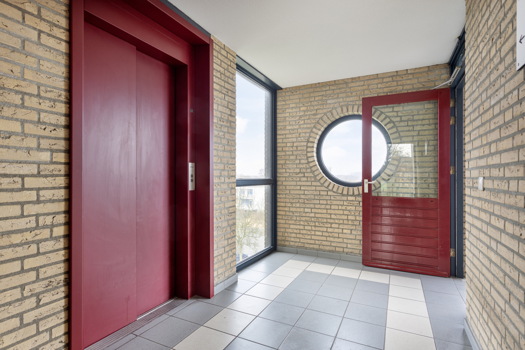 Centrale entreehal met brievenbussen, bellentableau, intercominstallatie, trappenhuis en liftinstallatie.