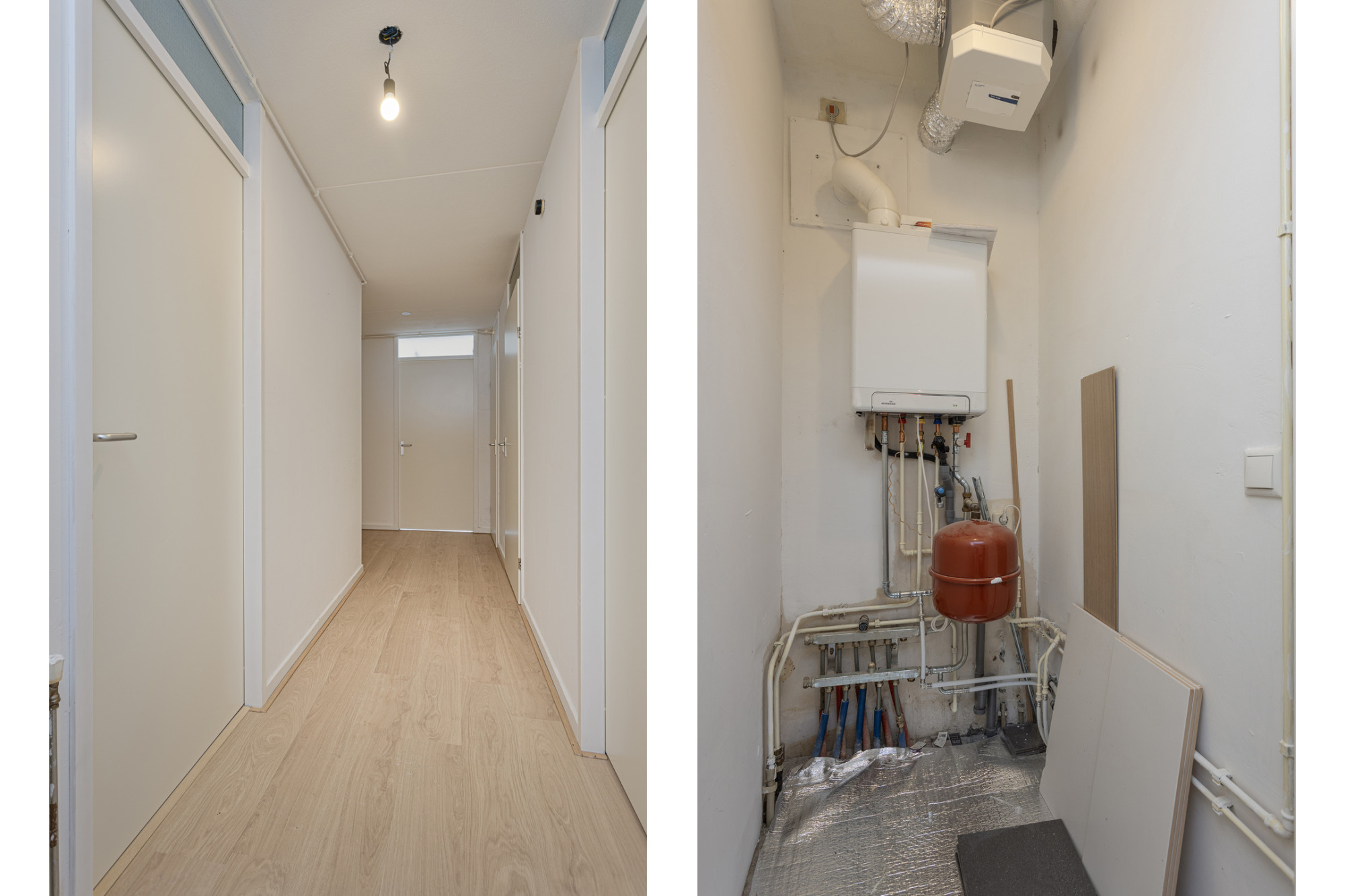 Technische ruimte/berging met opstelling Cv combi installatie (Intergas HRE, bouwjaar 2022, eigendom). Twwe slaapkamers