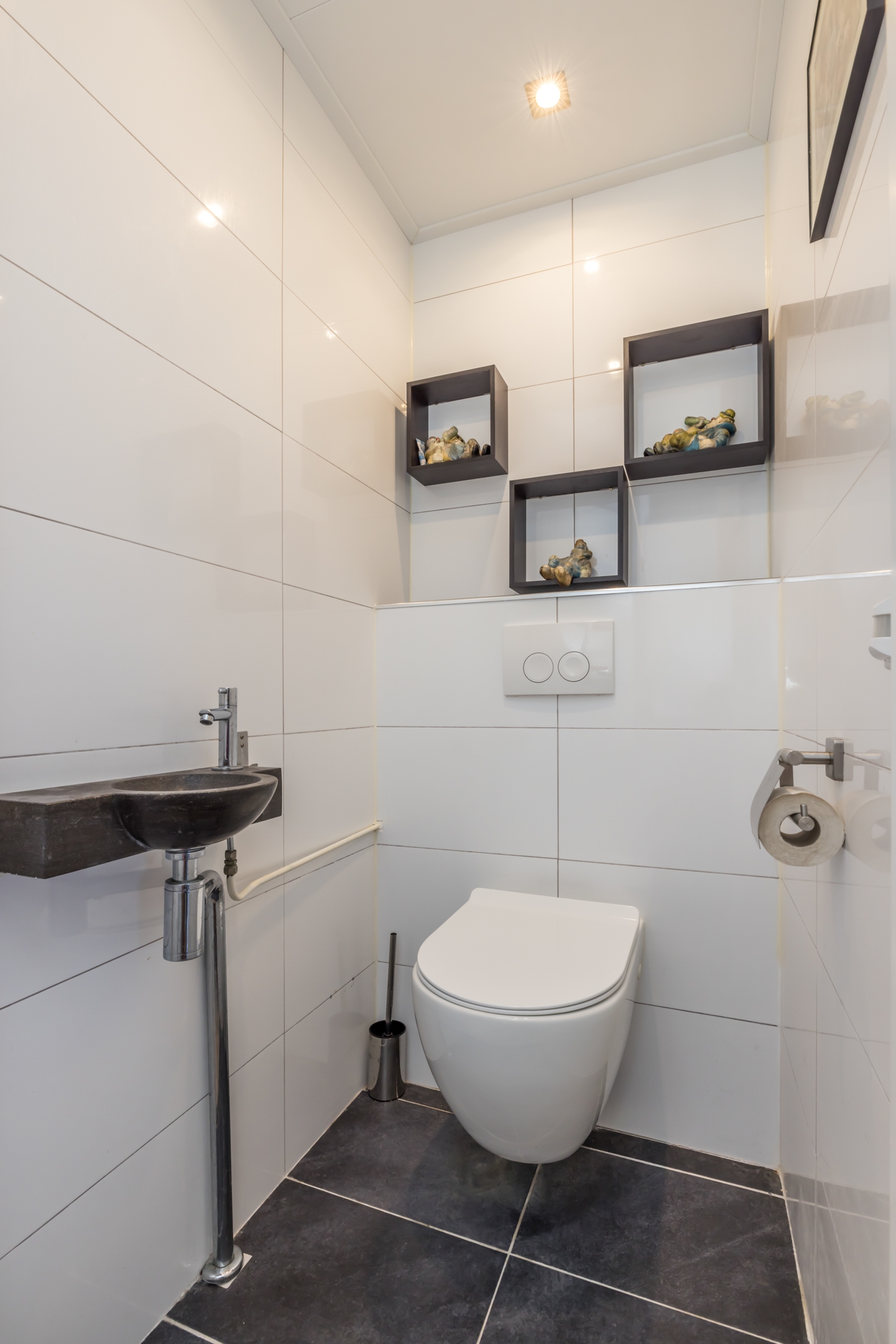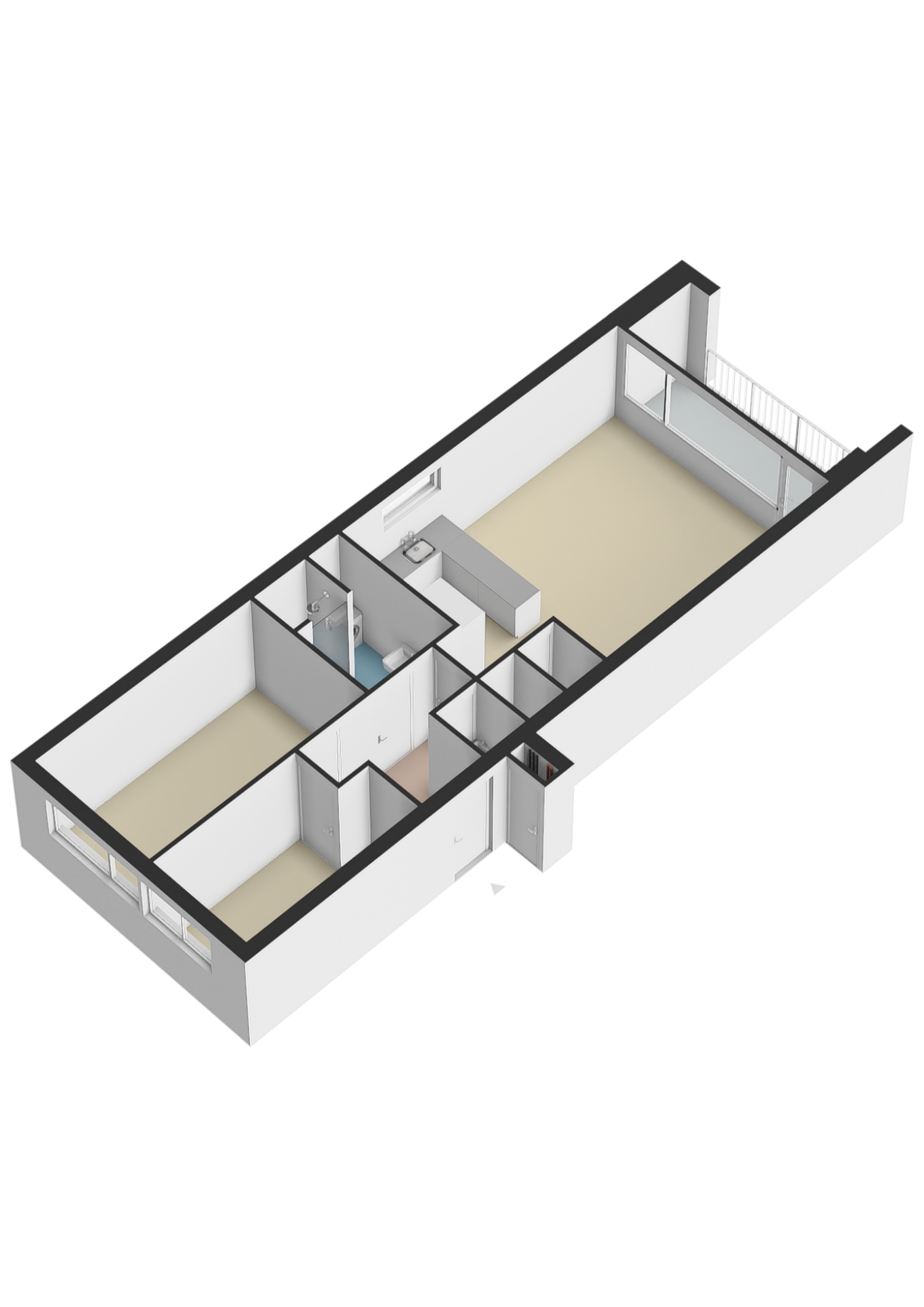 Vanuit lift of trap inpandig te bereiken voordeur, betegelde, vernieuwde vrij hangend toilet. Hiernaast gelegen de 2 ruime slaapkamers.