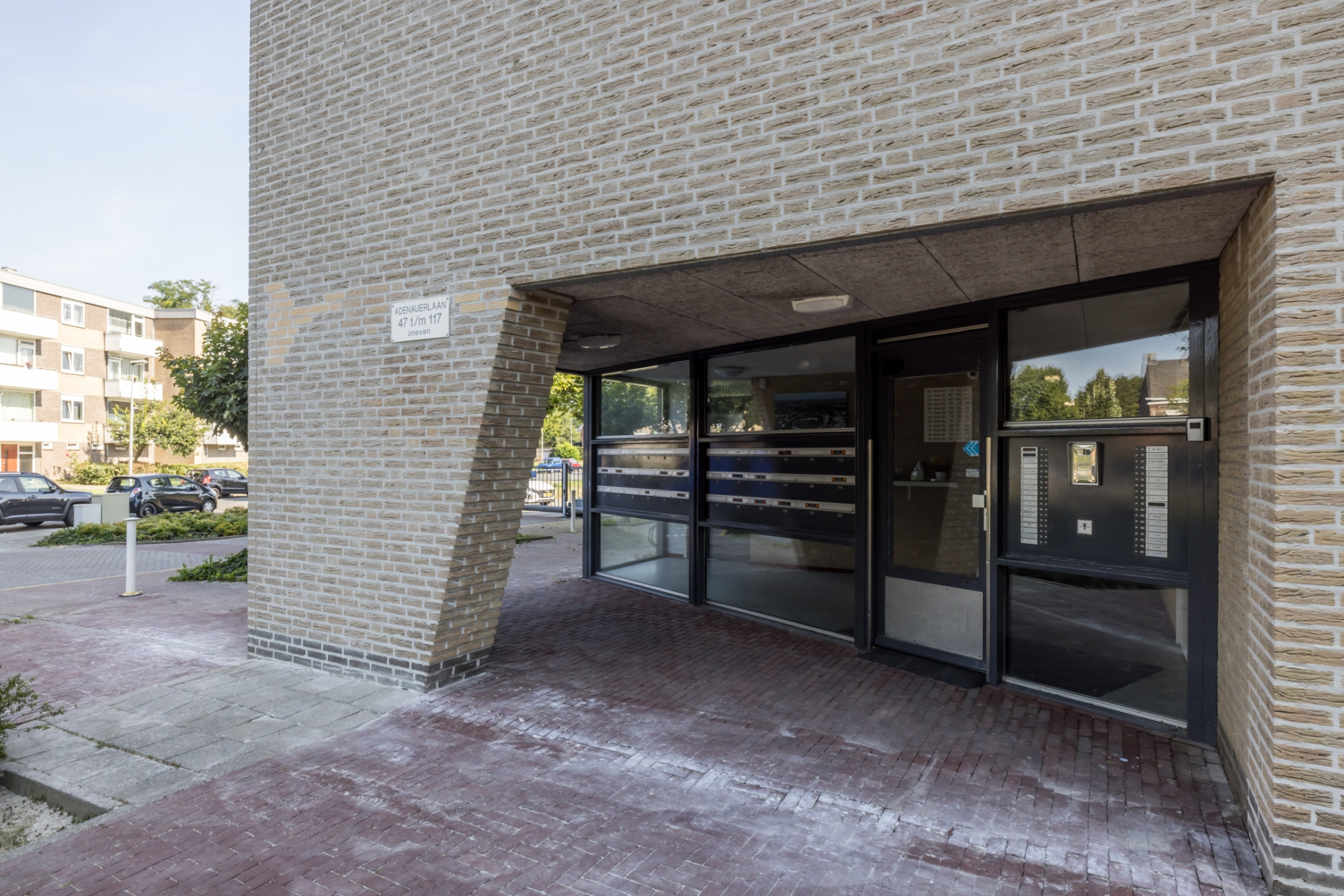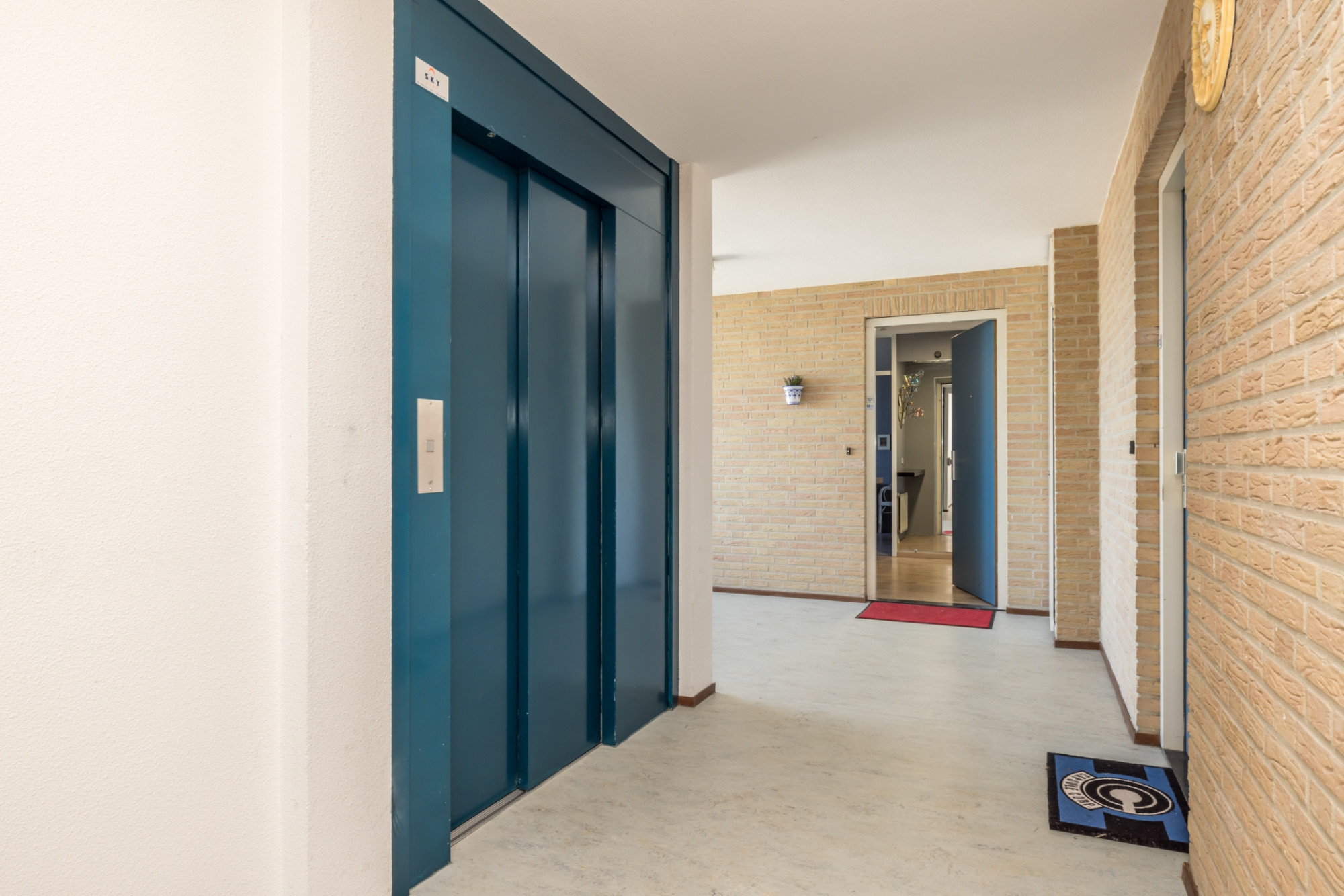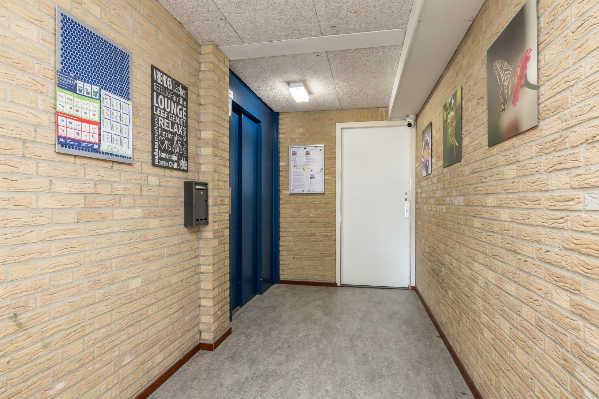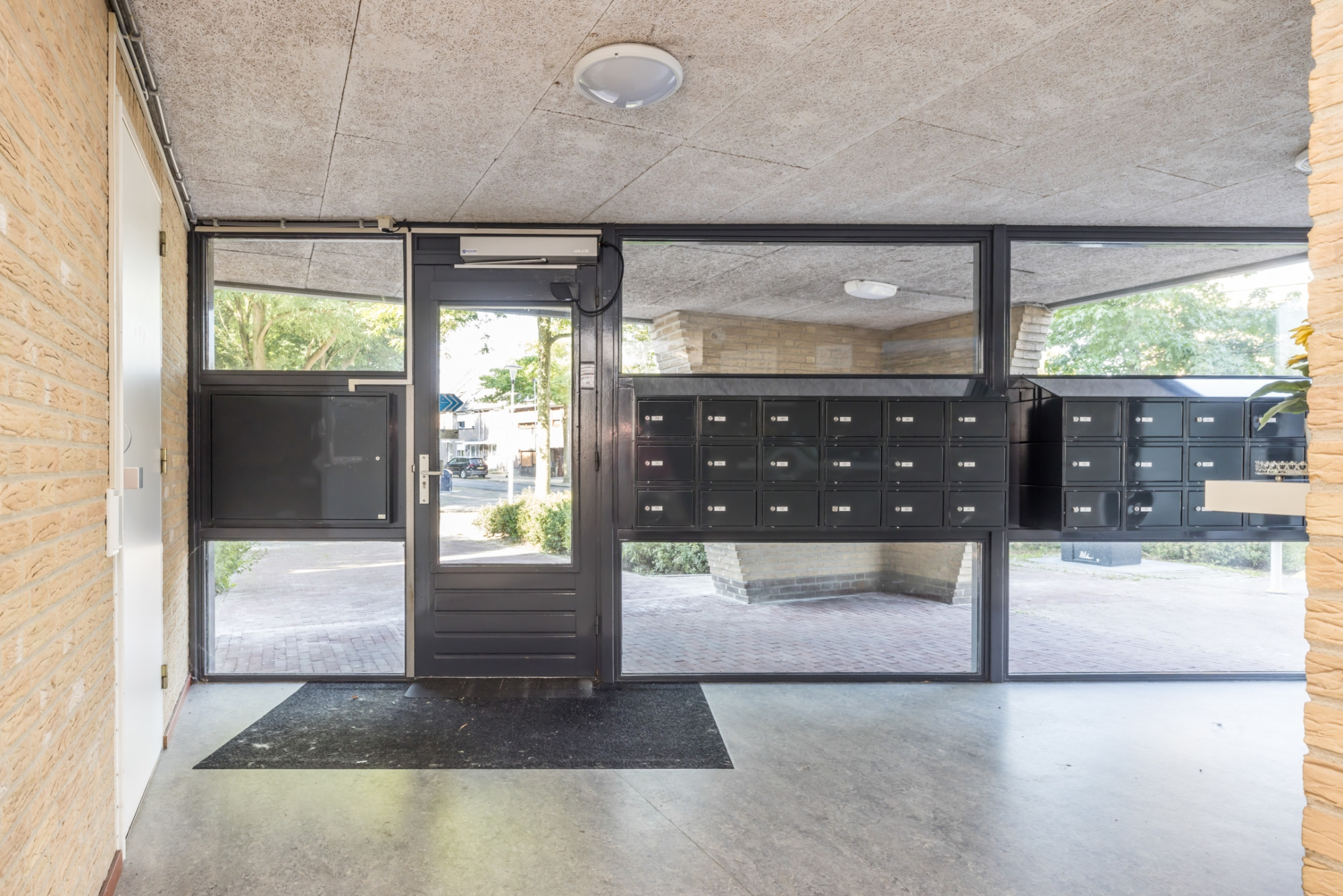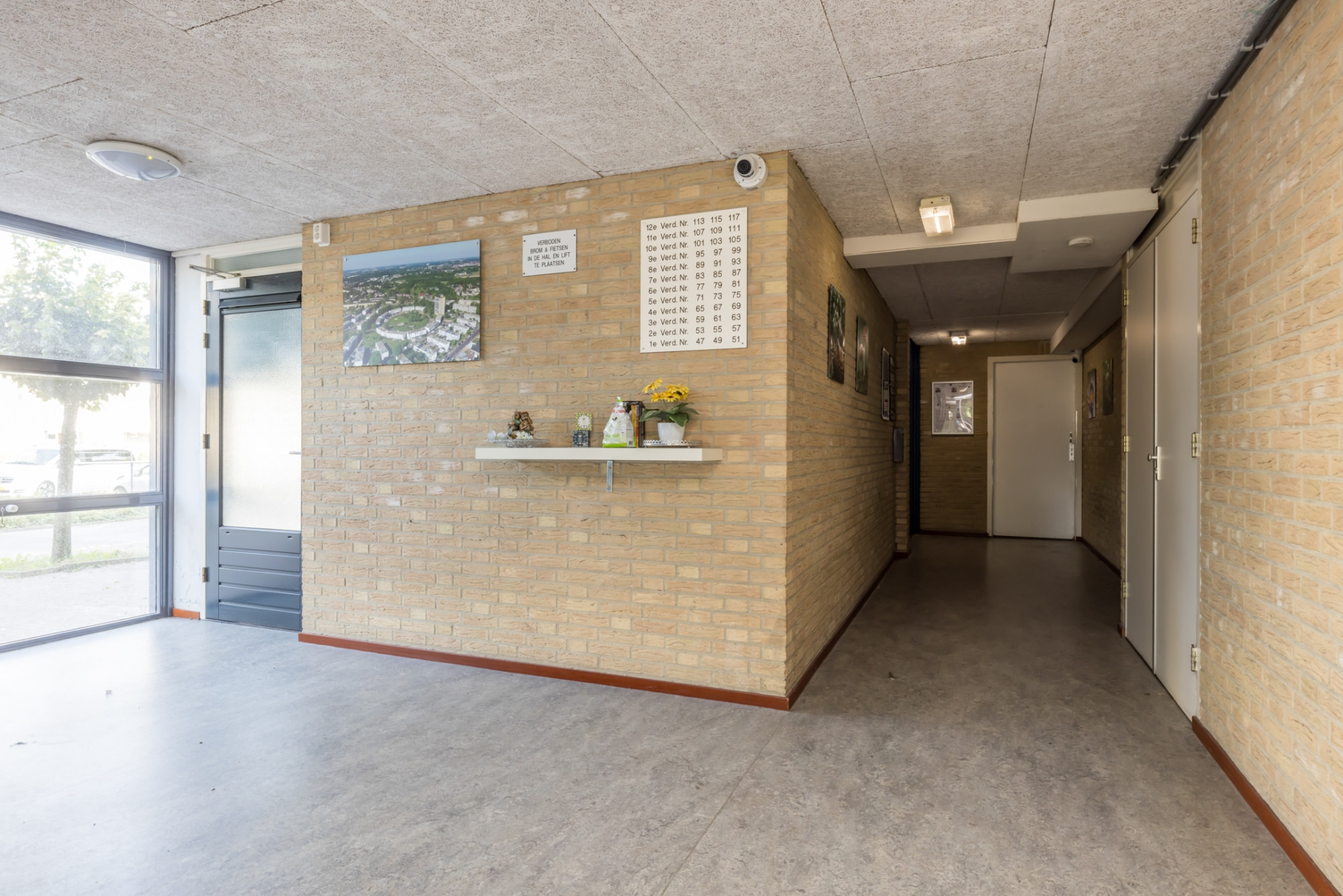Representatieve entree met bellentableau en brievenbussen. Centrale hal met trappenhuis en lift.