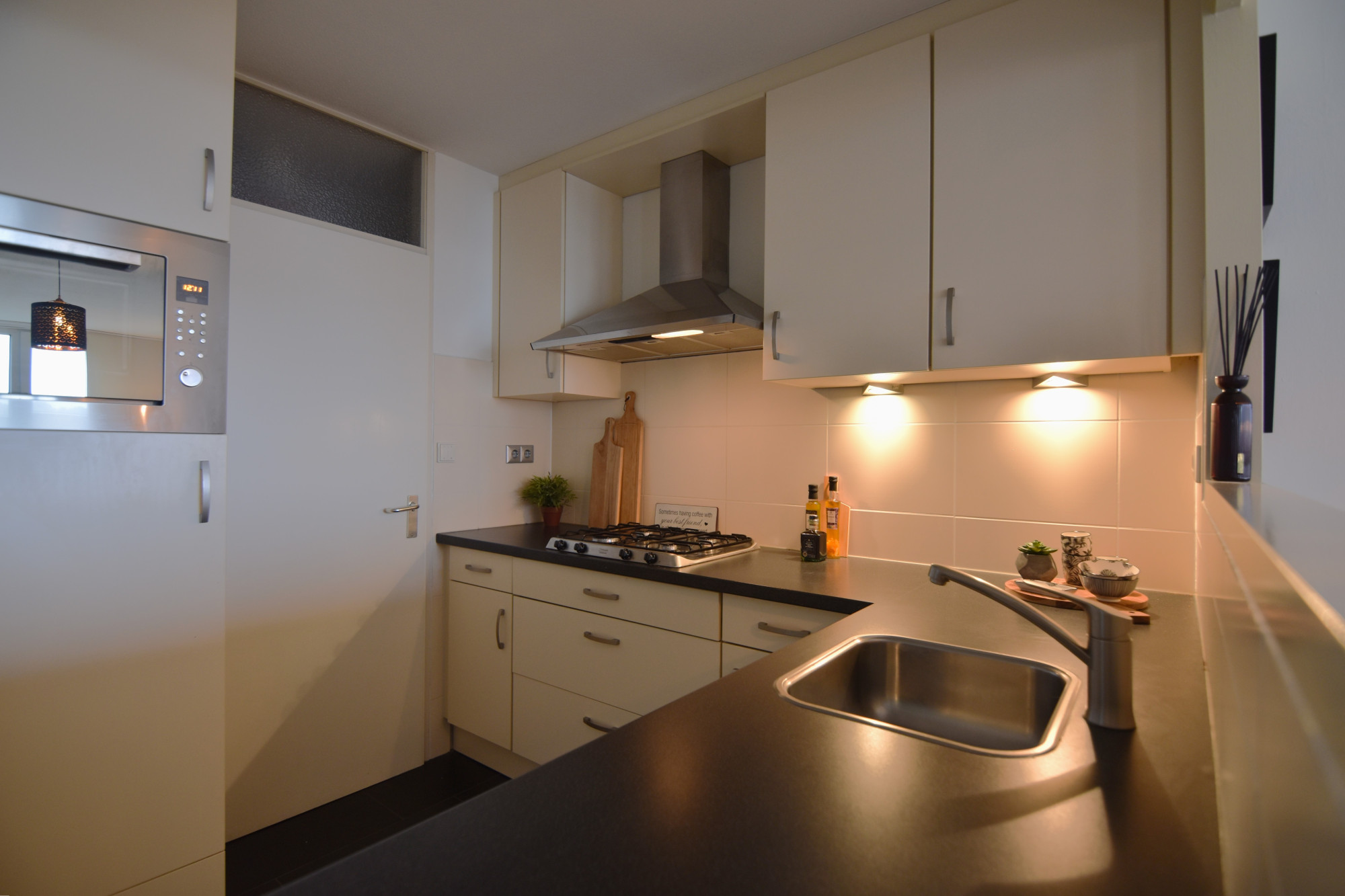 De open keuken (2,42 m x 2,11 m) is v.v. installatie en apparatuur; 4- pits gaskookplaat, afzuigkap, combi- oven en koelkast. De berging is vanuit de keuken te bereiken alwaar aansluitingen cv-ketel en witgoedapparatuur.