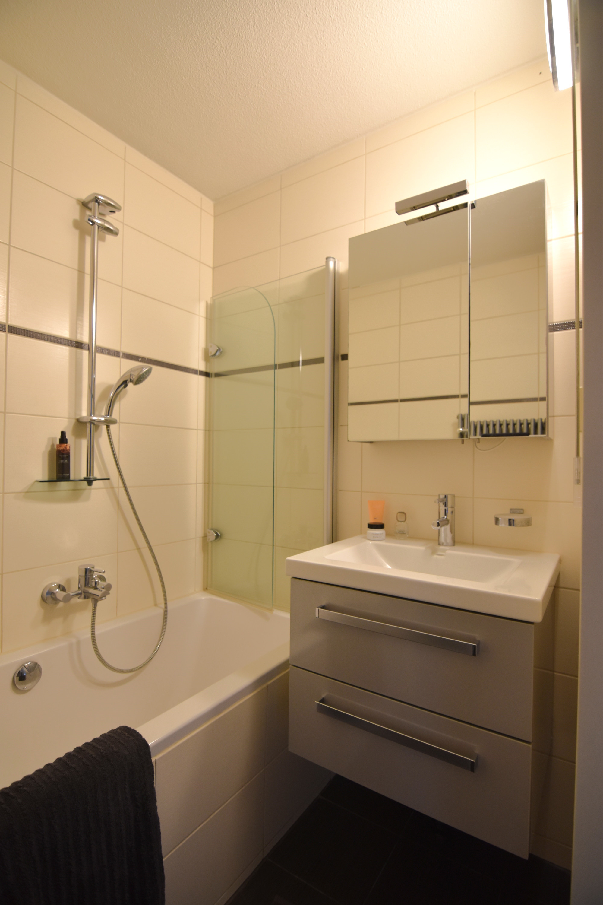 De badkamer (1,81 m x 1,53 m) is v.v. een ligbad (met douche mogelijkheid) en vaste wastafel met meubel.