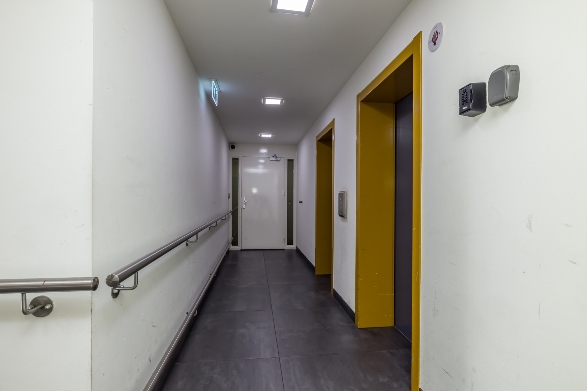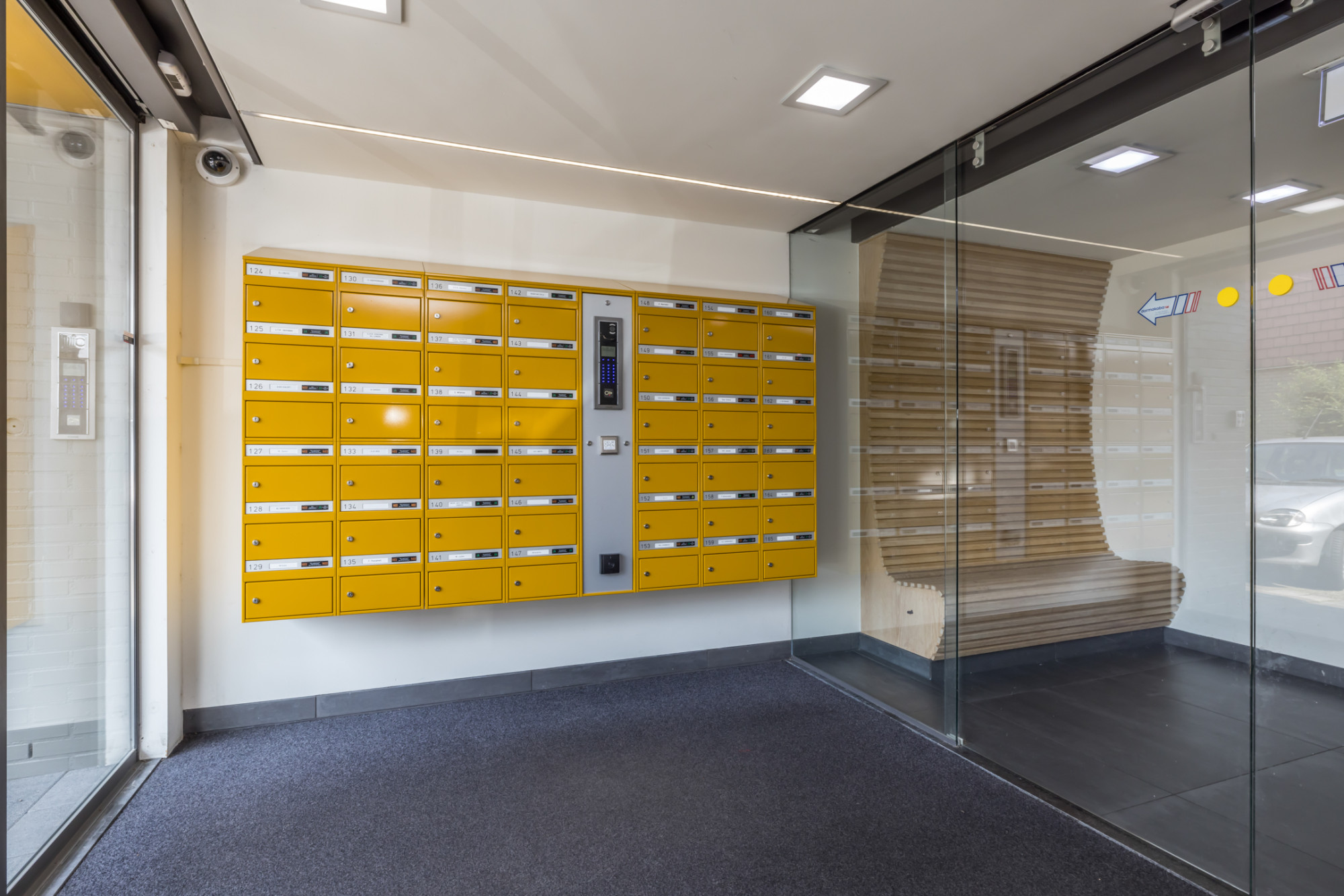 Gezamenlijke entree met bellentableau, intercominstallatie en brievenbussen. Toegang tot de lift, gezamenlijke fietsenstalling en het trappenportaal.