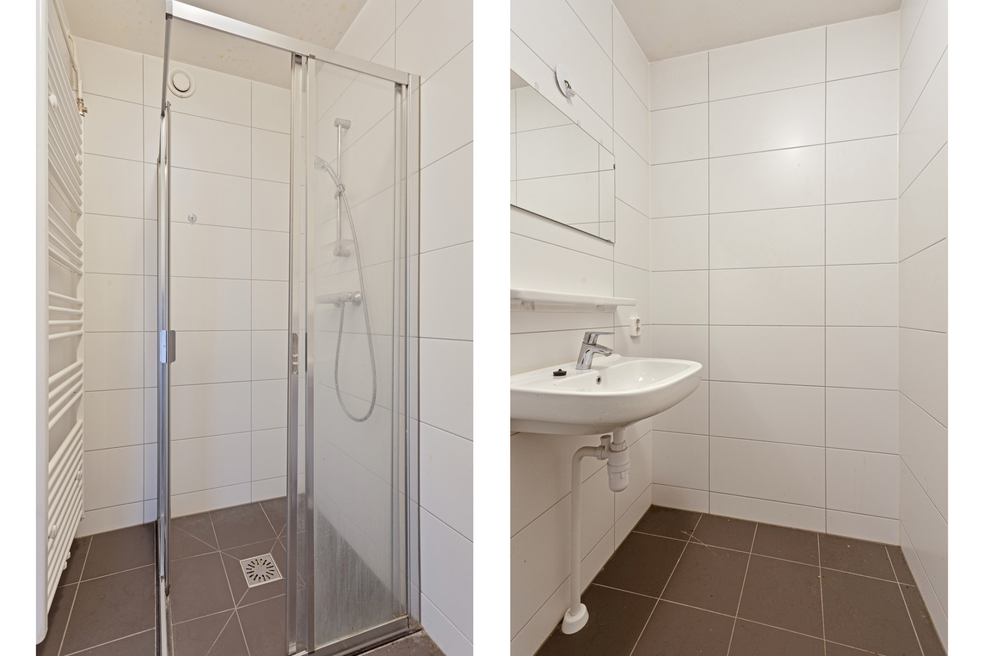 Deels betegelde badkamer (2.32 x 1.40 m) met douche en vaste wastafel.