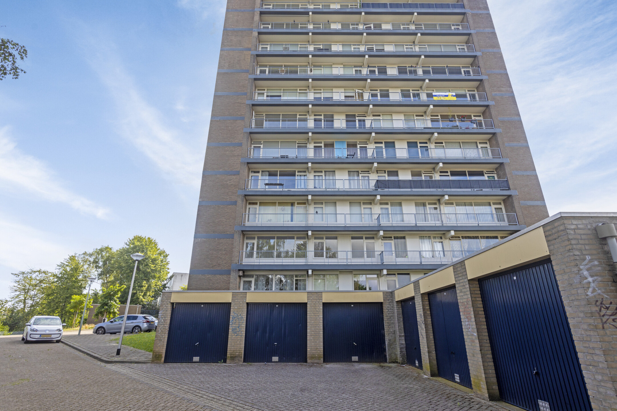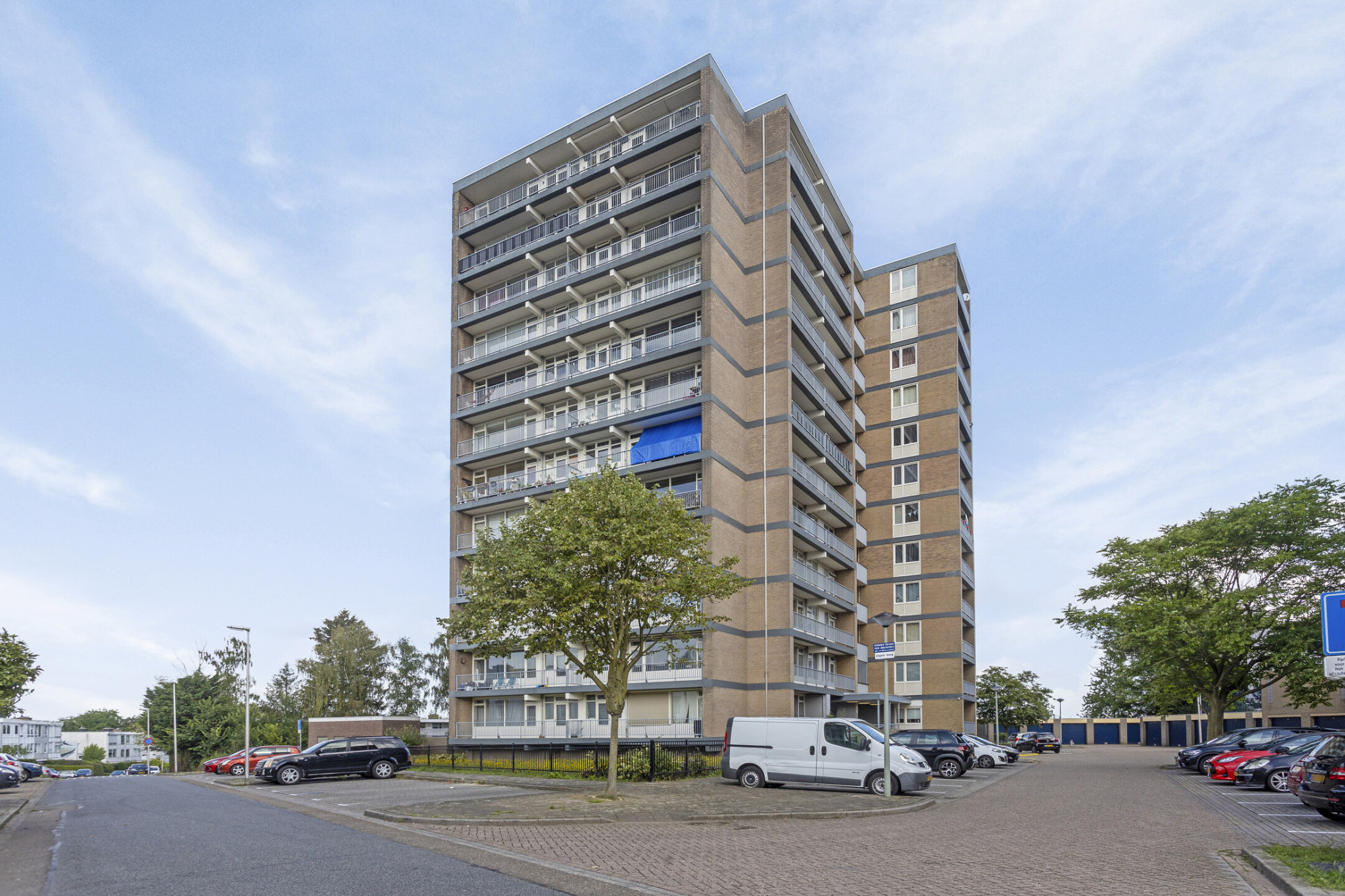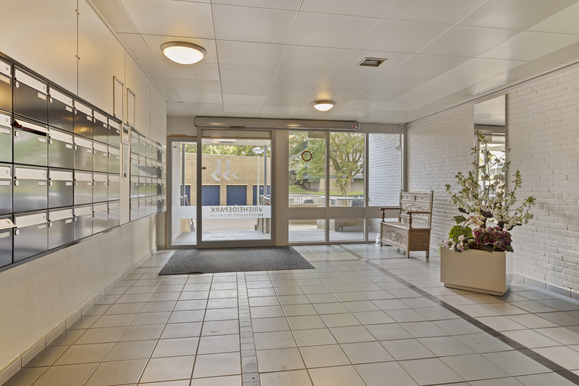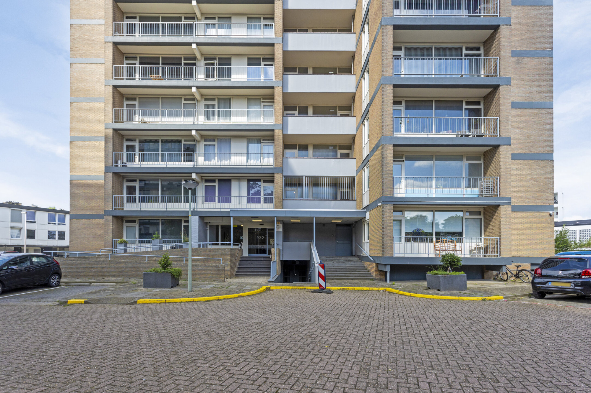 Centrale ingang met bellen plateau, brievenbussen en liftinstallatie; voldoende parkeergelegenheid rondom het complex.